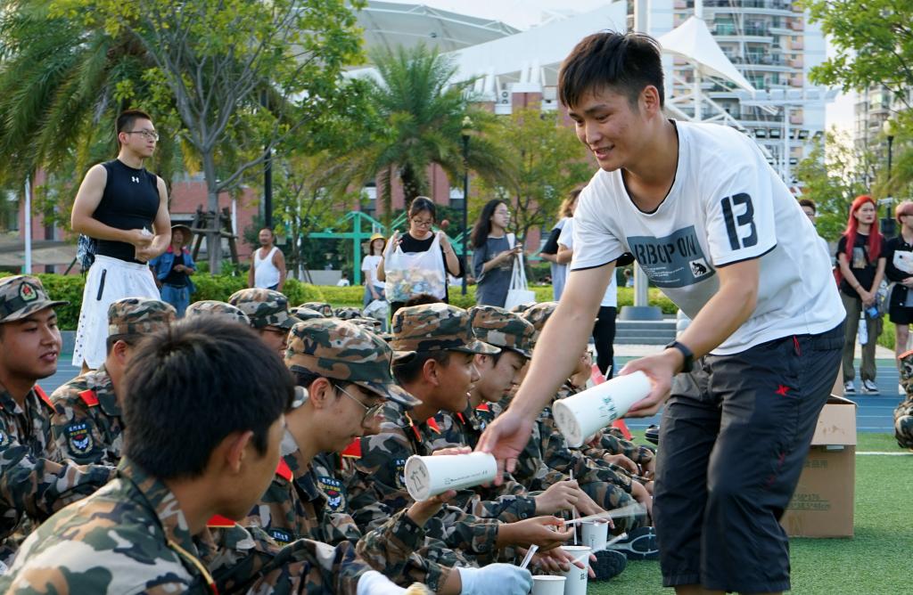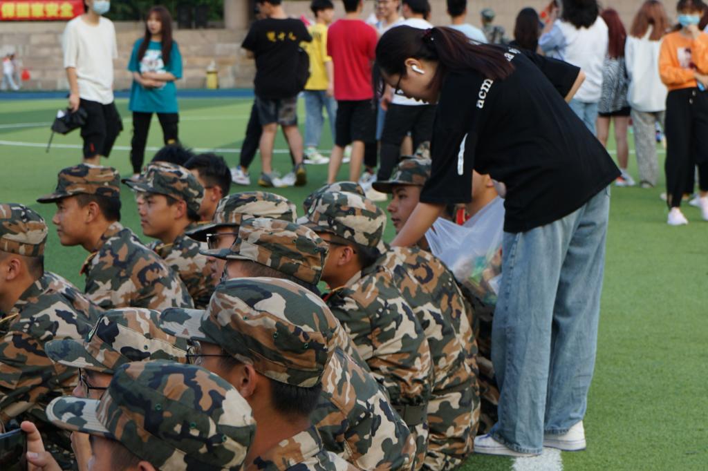 在军训慰问活动的开场,本科生团总支和学生会的学生干部们将慰问品分发给新生们。