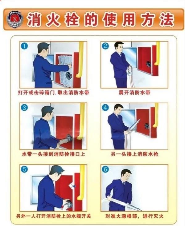 1.打开消防栓,旁边如有按钮则按下内部火警按钮。