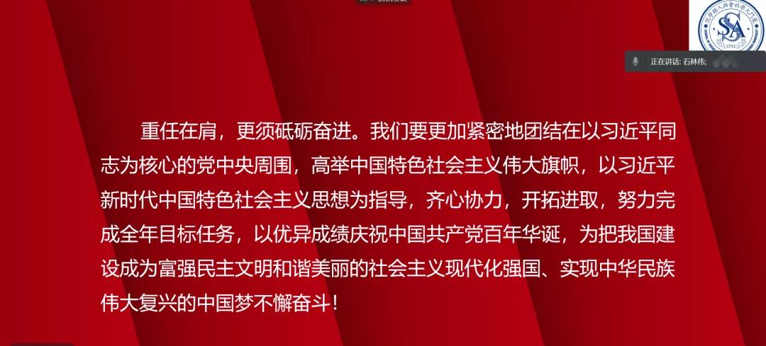 学习会上大家积极互动,谈到国家在2020年新冠疫情影响下所表现出的大国风范、在2020年脱贫攻坚工作中取得的骄人成绩、在“十三五”时期的辉煌成就,大家的自豪与激动之情溢出屏幕。