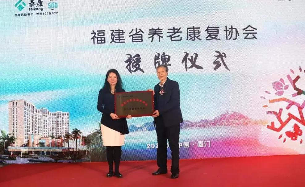 福建省民政厅原副巡视员、省养老康复协会会长翁建国授予泰康之家·鹭园副会长单位牌匾。