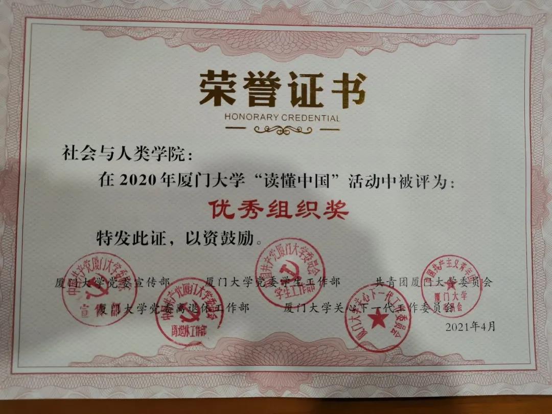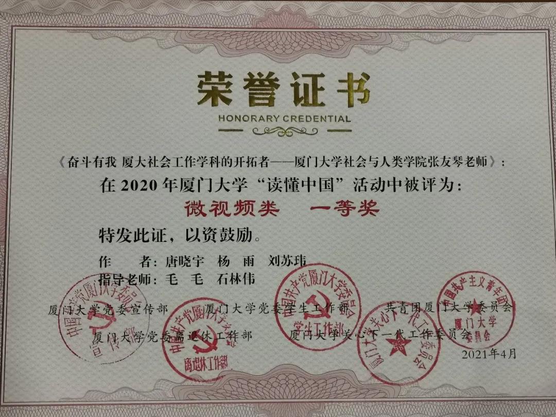 我院学生唐晓宇、杨雨、刘苏玮在党委副书记毛毛老师、团委书记石林伟老师的指导下,创作的微视频作品《奋斗有我,厦大社会工作学科的开拓者——厦门大学社会与人类学院张友琴老师》荣获2020年厦门大学“读懂中国”活动微视频类一等奖,我院荣获优秀组织奖。