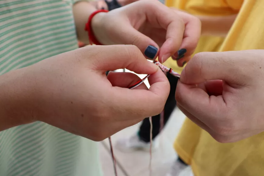 五彩绳又叫五色缕、五色线、朱索、百索等,一支支五彩绳的材料,寄托着我院师生的真诚祝福,祈愿全校师生都能喜乐安康。