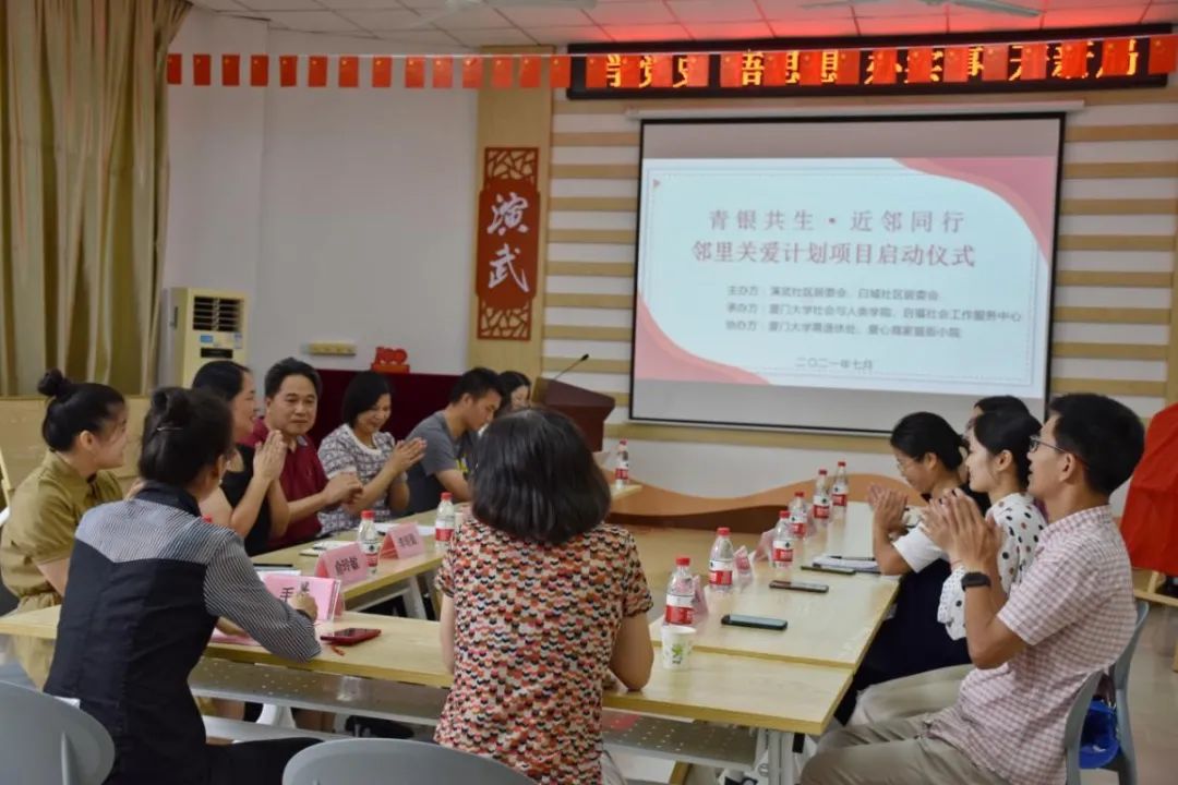 2021年7月13日上午,由厦门市演武社区、白城社区、厦门大学社会与人类学院、厦门大学离退休处、厦门市启福社会工作服务中心、猫街小院共同打造的“青银共生·近邻同行”邻里关爱计划项目启动仪式在演武新时代文明实践站举办。演武社区党总支书记张丹晖、白城社区党委书记李晓勤、厦门大学离退休处副处长周一钦、厦门大学社会与人类学院党委副书记毛毛、社会工作系副系主任魏爱棠教授、团委书记石林伟、辅导员冉丽莎、社工实习督导徐蕾、启福社会工作服务中心主任俞玲敏、实习生和厦门大学志愿者代表参与了项目启动仪式。仪式由俞玲敏主持。