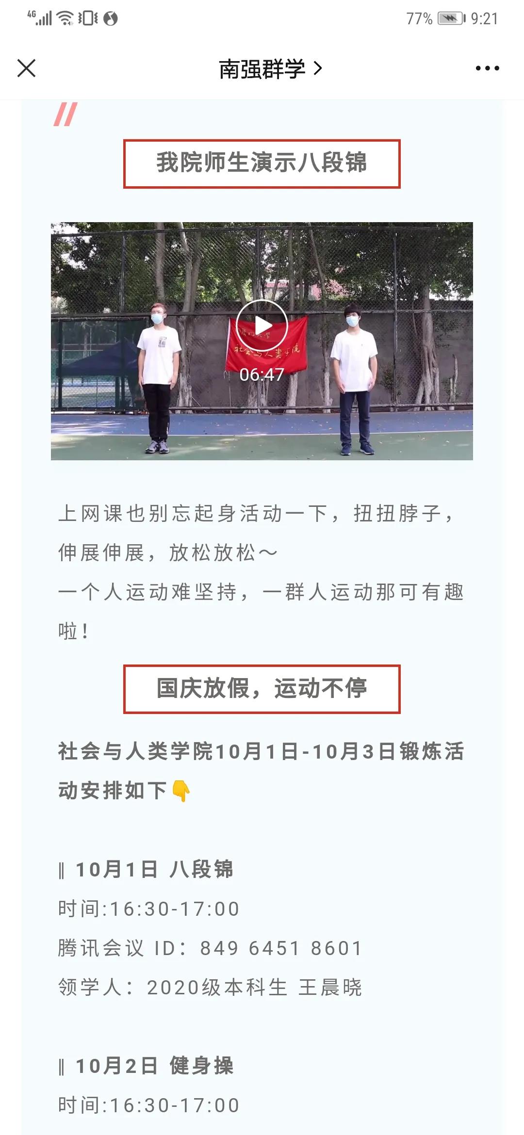 “战疫强体魄,奋进新百年”。强身健体是保持健康的一味良方,在疫情防控常态化的当下,我院师生在国庆期间开展每日30min“云”锻炼,通过线上平台,吸引同学们云端共同健身。增强体魄,调节身心健康。