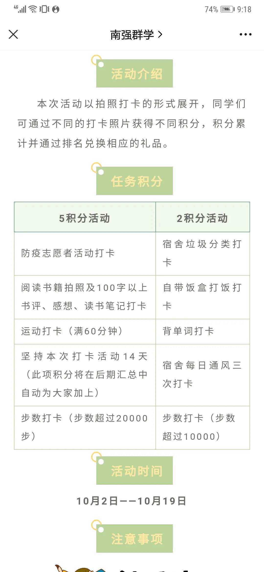 此外,我院充分发挥网络平台的积极作用,在学院公众号上推出了“健康生活,抗疫有我”打卡活动,诸如垃圾分类、自带饭盒、宿舍通风、运动与学习等都可以参与打卡哦!
