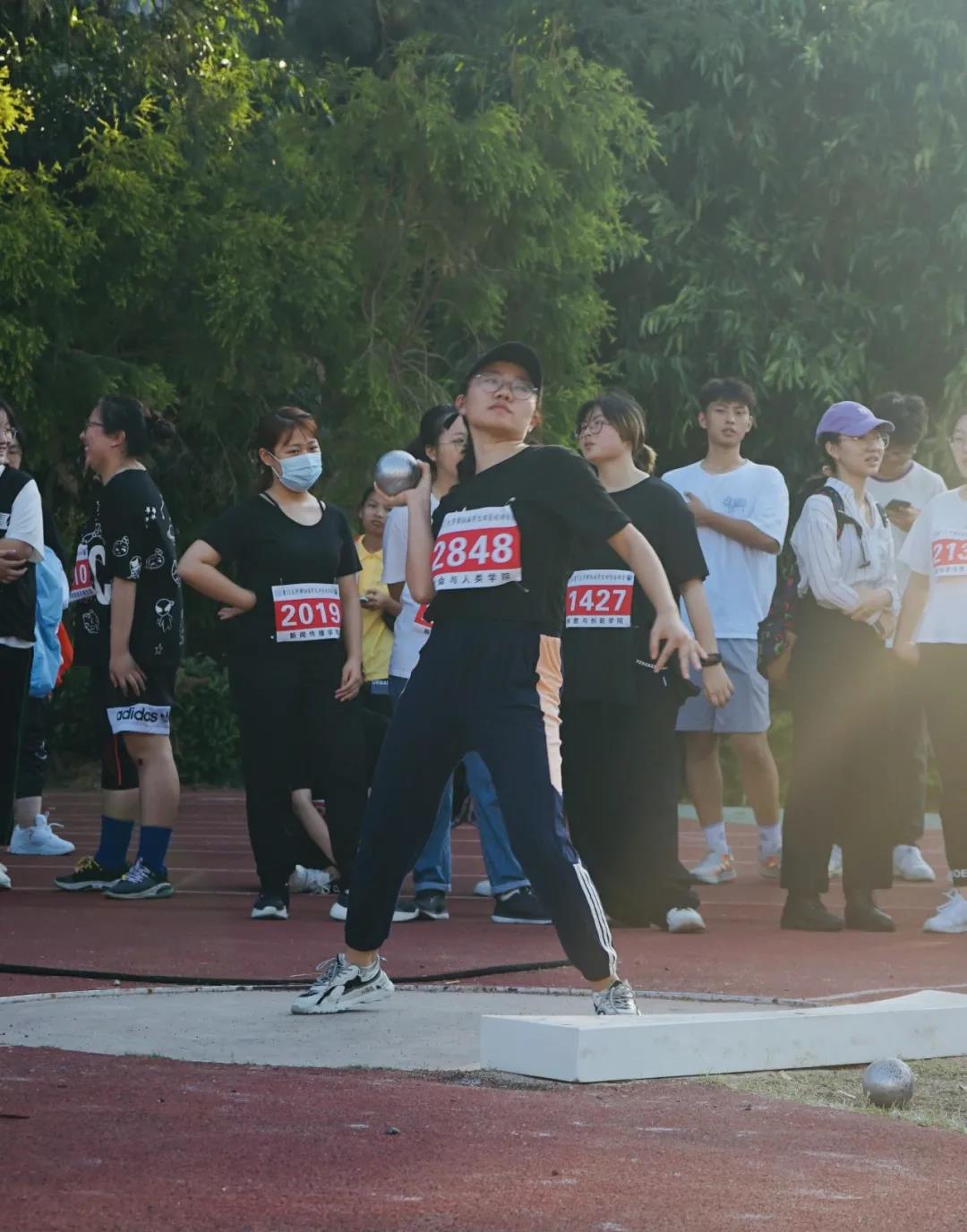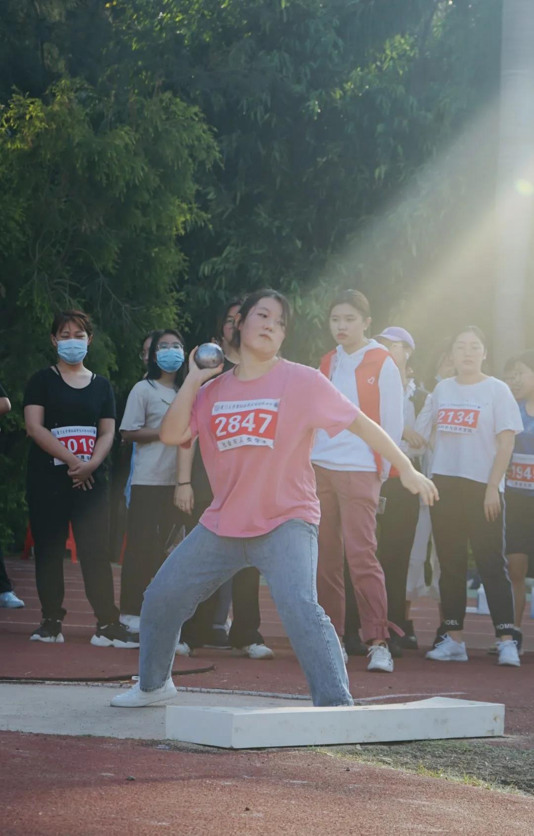 镜头一转,来看看小姐姐们的出色表现吧!握紧手中的铅球、沉着蓄势、奋力一掷。在上弦场阳光的照射下,飞腾的铅球划出一道完美的弧线。我院张亚楠、陈昕同学,在赛场上表现出强有力的爆发感,展现出了自己最好的一面。