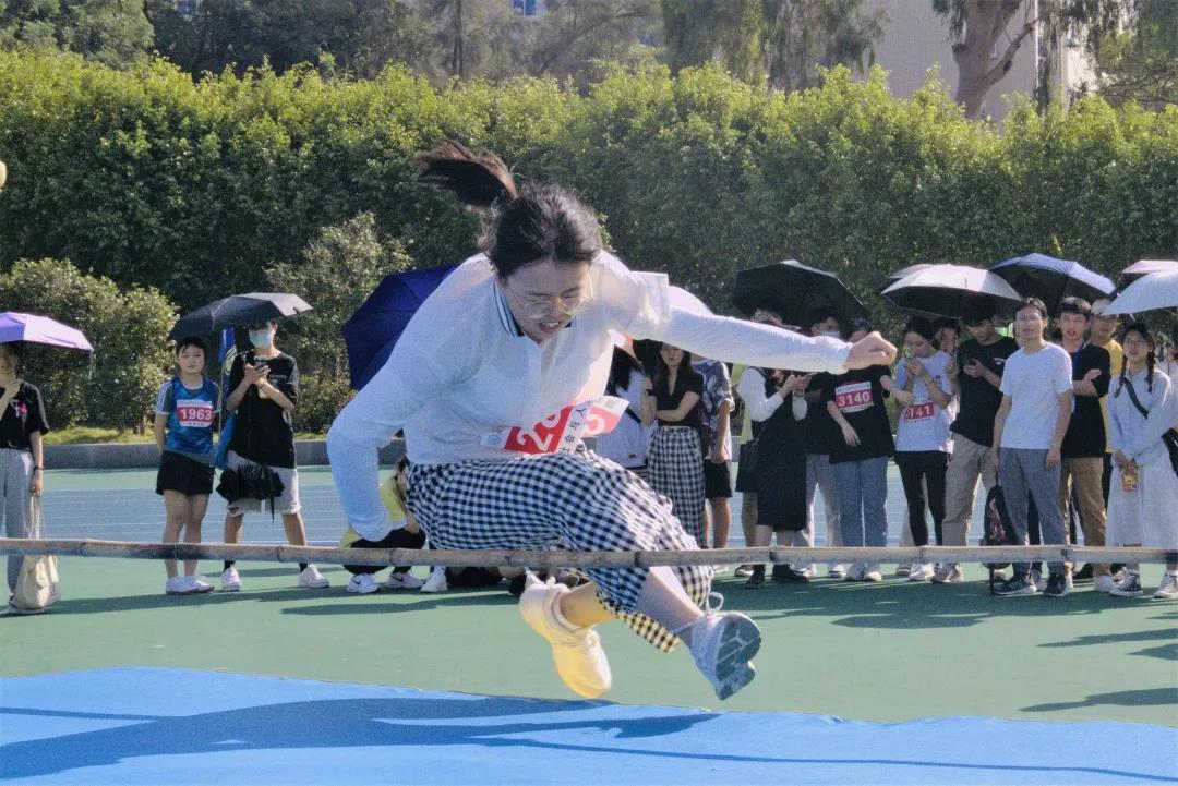 接下来是我院研究生女子跳高运动员周悦。从助跑到起跳,她的目光始终坚定,闪烁着无畏的光芒。