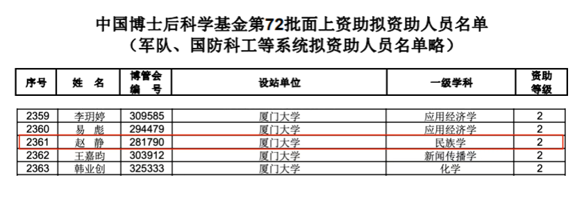 2022年11月25日,中国博士后科学基金第72批面上资助拟资助人员名单公示结束,我院人类学研究所博士后赵静申报的《基于古DNA技术的贵州夜郎地区人群演化历史研究》在民族学方向获批。
