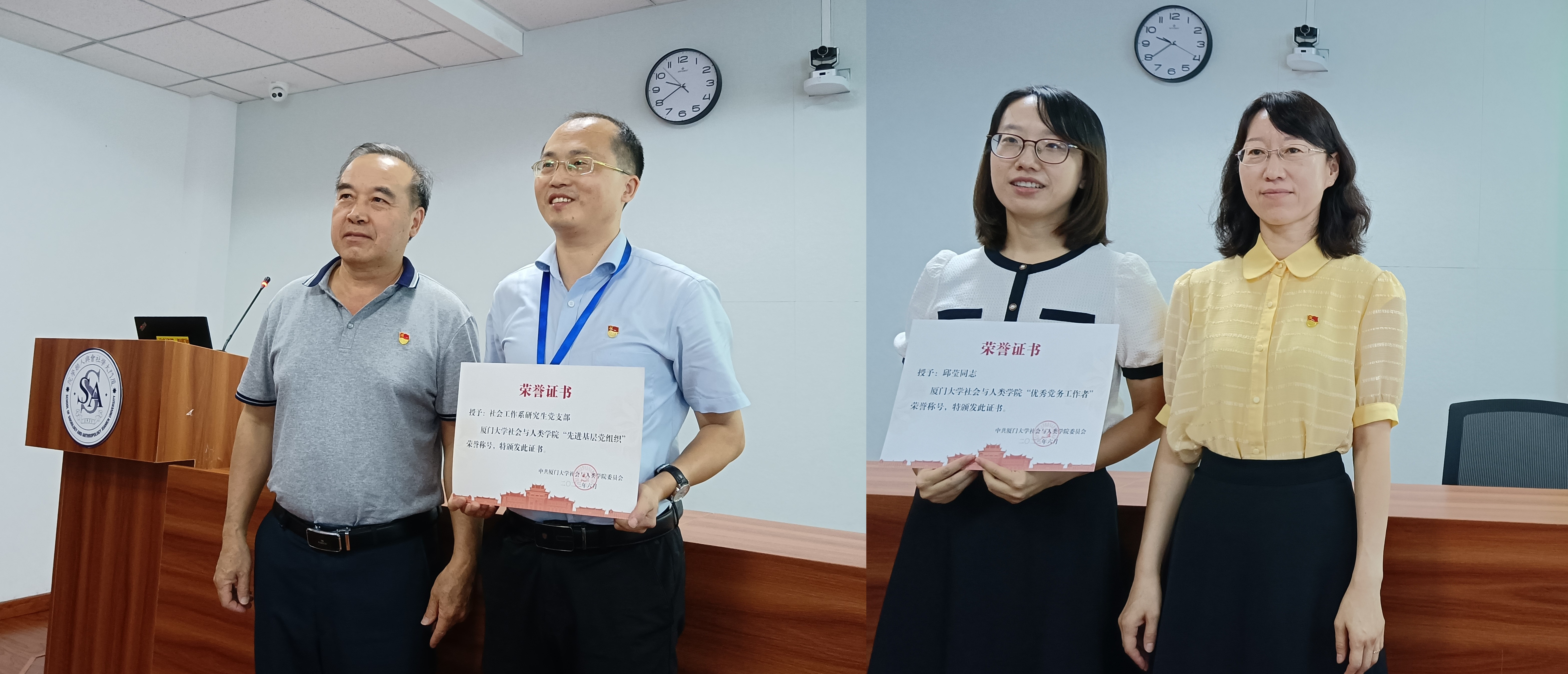 会上,毛毛宣读《关于表彰社会与人类学院2022-2023年优秀共产党员、优秀党务工作者和先进基层党组织的决定》,林金枝、王晓丽、冯文晖为优秀共产党员、优秀党务工作者和先进基层党组织颁发荣誉证书,现场师生用热烈的掌声向受表彰对象表示祝贺。