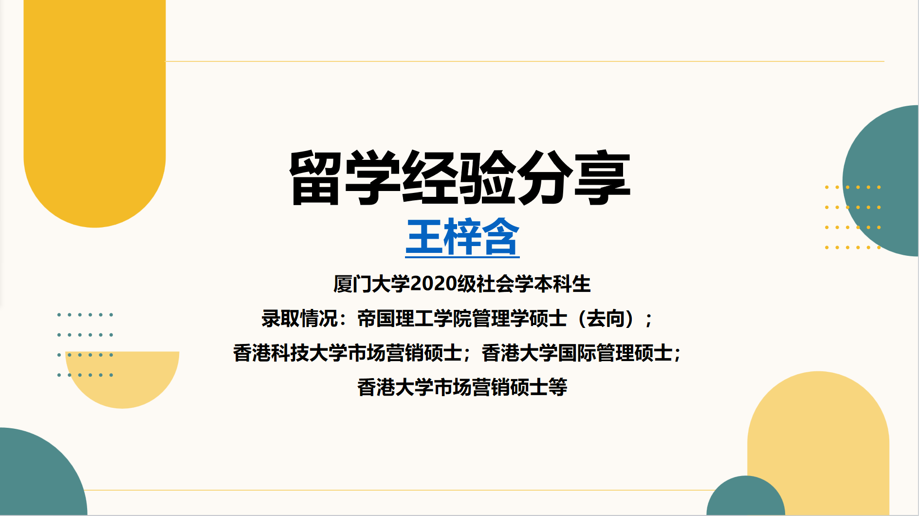 学长学姐经验分享2020级社会学专业本科生王梓含现就读于帝国理工学院管理学硕士,她结合个人经历介绍了申请国外院校的时间线和流程图,建议同学们充分运用STAR法则,对意向学校及专业作详细备调,实现个人与项目的双向匹配,进而“去到一个最适合自己的地方”。