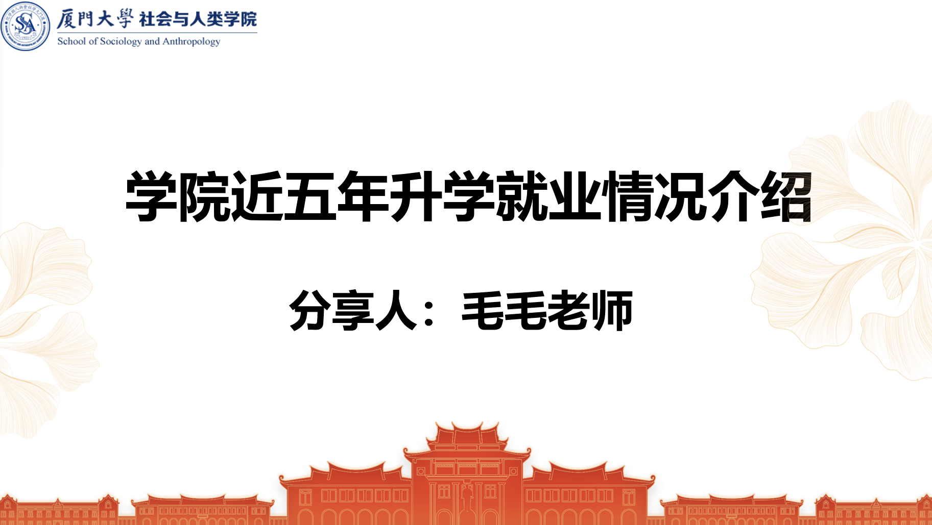10月12日,社会与人类学院“学长学姐考研/保研/出国出境经验分享会”在曾呈奎楼B栋203教室顺利举行。学院党委副书记毛毛出席活动并作专题分享,四名来自不同专业的优秀学子代表作了经验交流,活动吸引了40余名本研学生参加。活动由院学生会主办、旨在贯彻落实“我为同学办件事”主题。