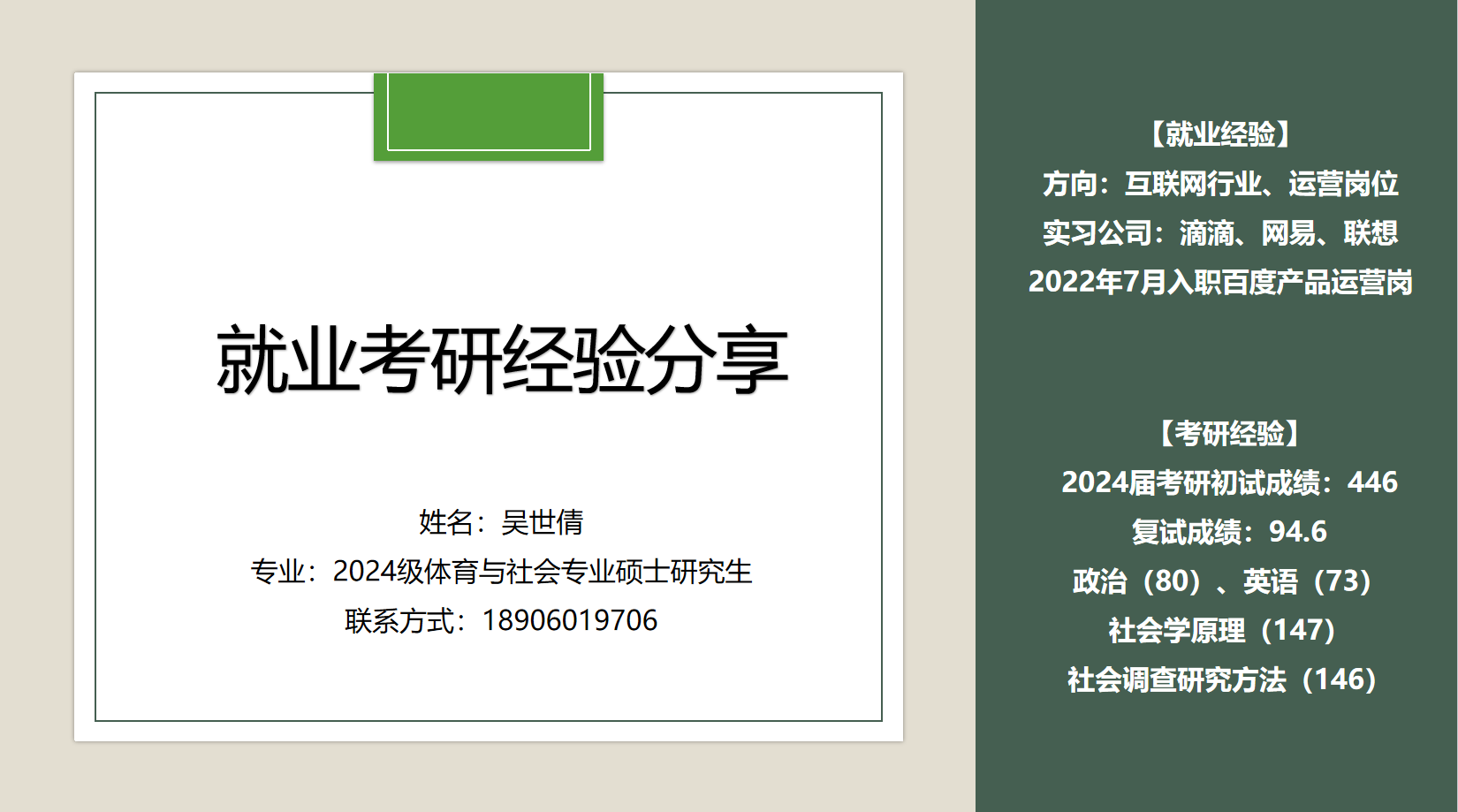 2024级体育与社会专业硕士生吴世倩分享了备战考研的时间规划和复习专业课的核心思路。她结合自己的工作经历,建议同学们在校期间积极参加社会实践,尽早找准契合的工作领域。她还分享了实习经历积累、简历制作准备和面试经验技巧等内容。