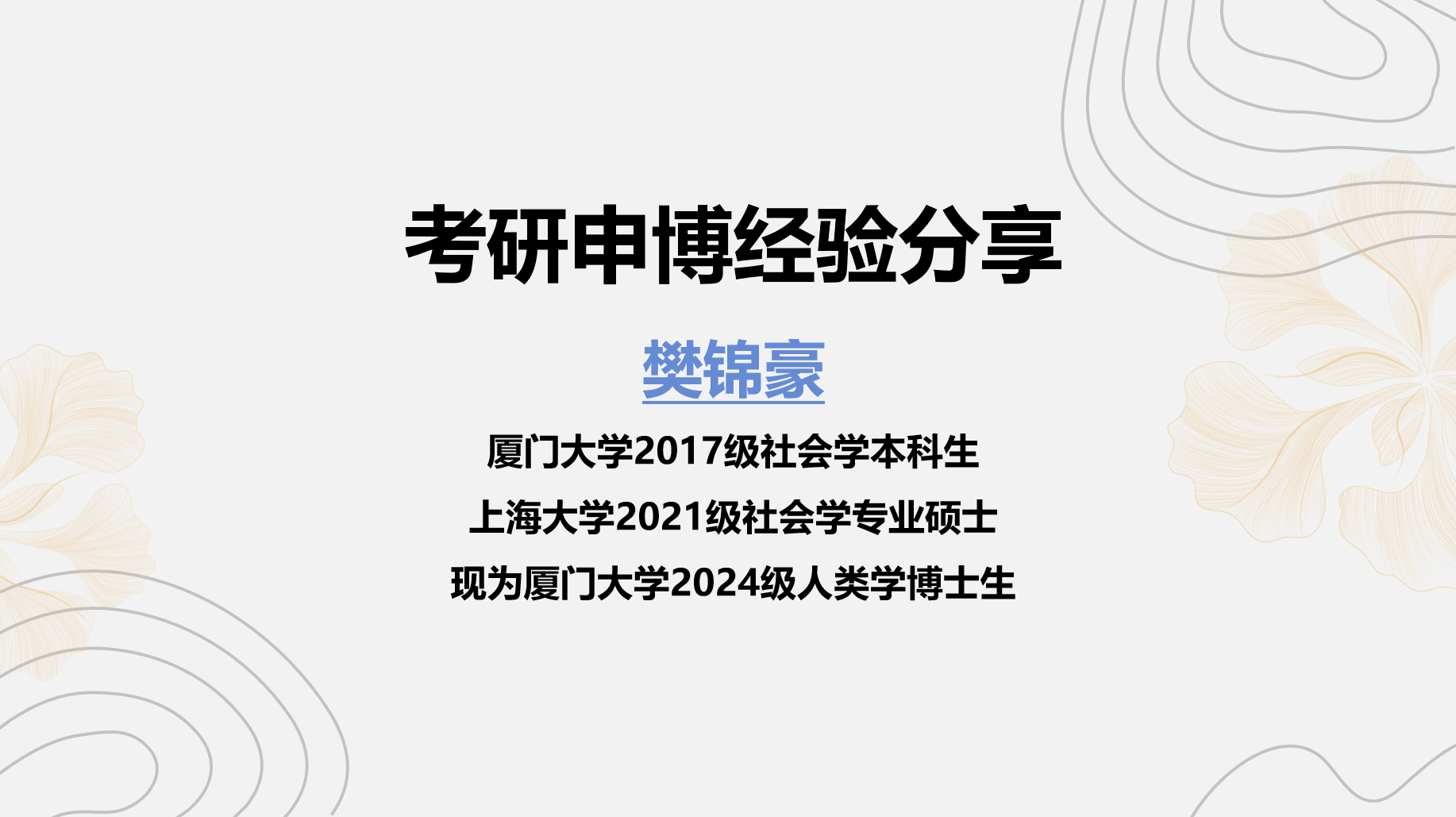 2024级人类学专业博士生樊锦豪分享了考研及申博的经验。他介绍了择校的基本方法和考研的时间安排,分享了掌握目标院校招生名额、新设专业、参考书目和导师研究方向的心得。他还从规划探索、申博窗口、技术要求等方面向同学们介绍了申博工作概况。