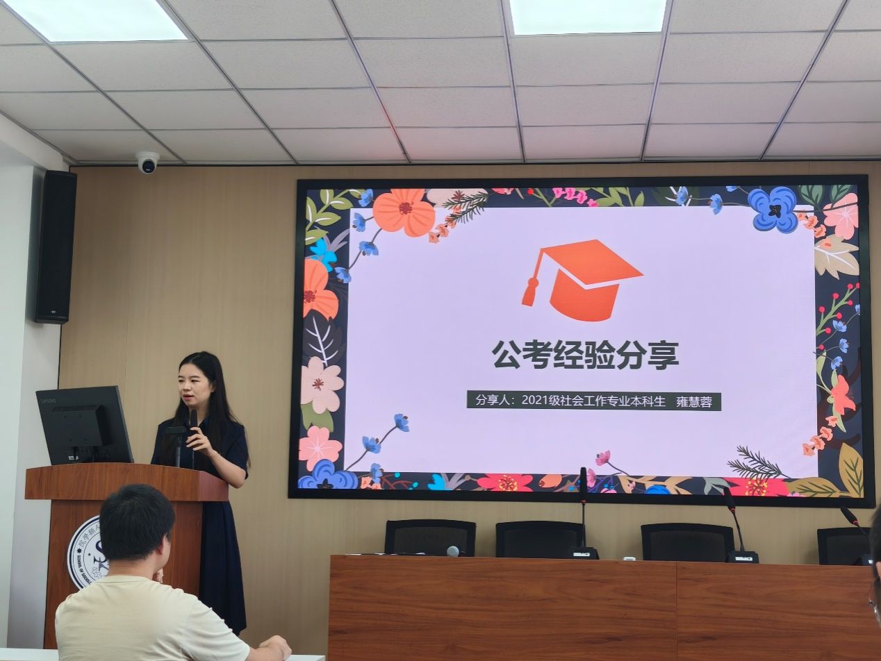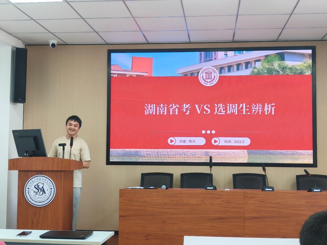 2021级社会工作本科生陈凡考取了湖南省考公务员。在分享会上,他从考试设置、岗位发展和决策逻辑三个方面,对比剖析了公务员考试与选调生考试的异同,详细介绍了两者考试形式、岗位性质等关键信息。他还分享了考公证件照制作的小技巧,助力同学们备考。最后,他强调报考公务员前需明确个人目标,结合自身实际进行生涯选择,希望大家坚定信心,为职业理想努力奋斗。