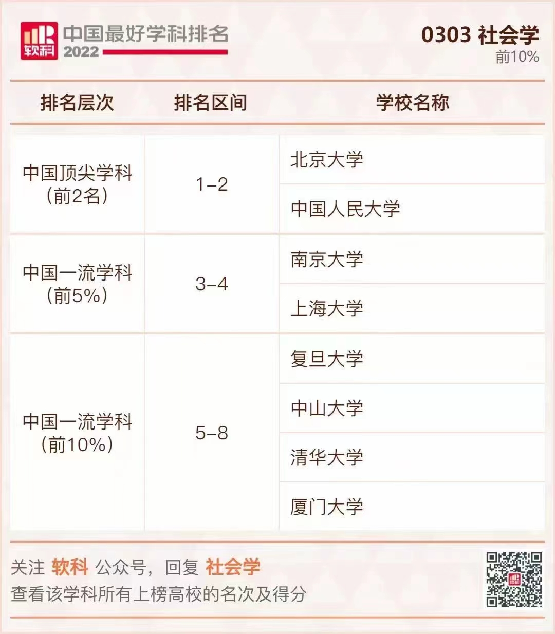 9月21日,高等教育评价专业机构软科正式发布“2022软科中国最好学科排名”。厦门大学共有40个学科名列其中。我院社会学学科入选“中国一流学科”,进入社会学学科前10%,位列全国第八,较2021年全国第九上升一个名次。