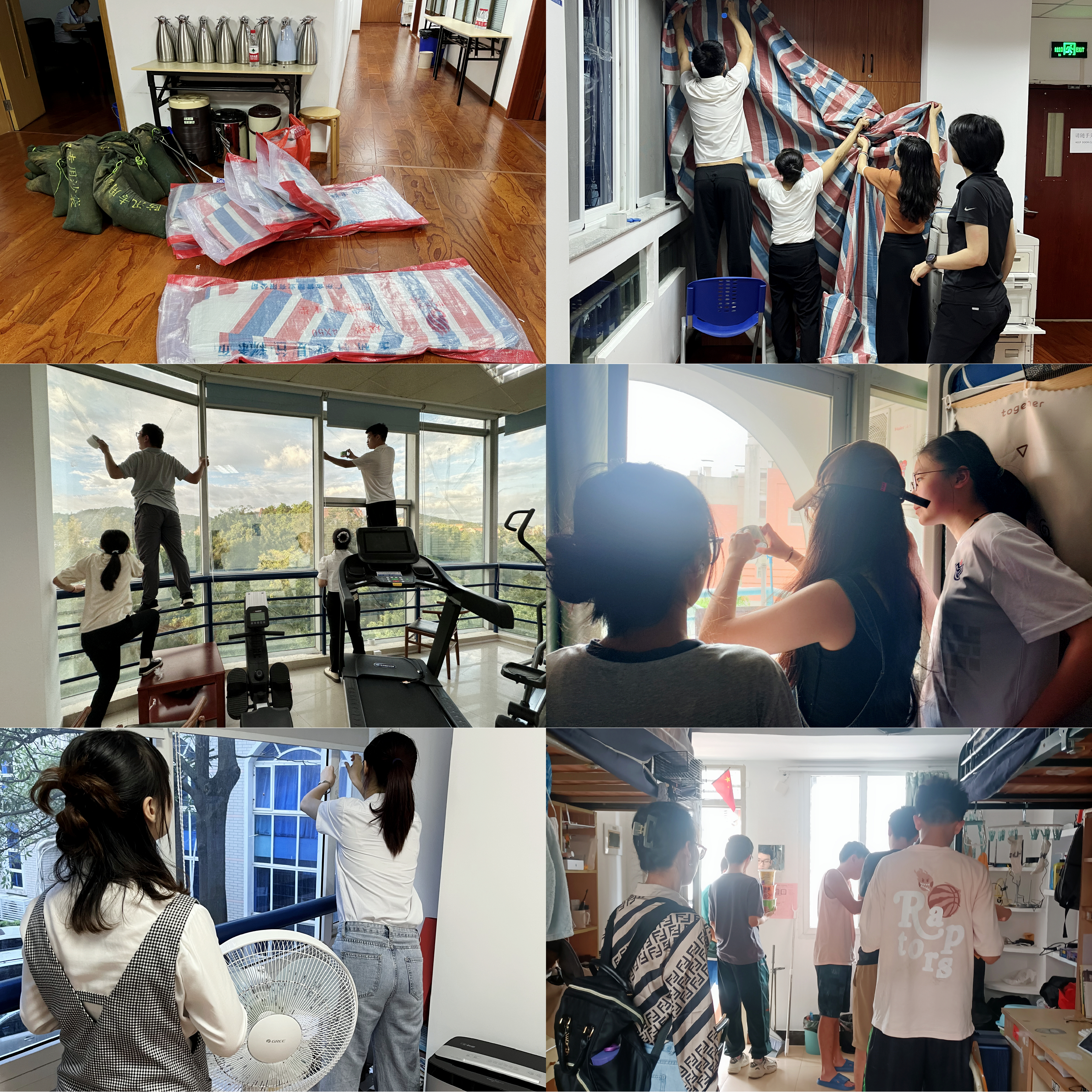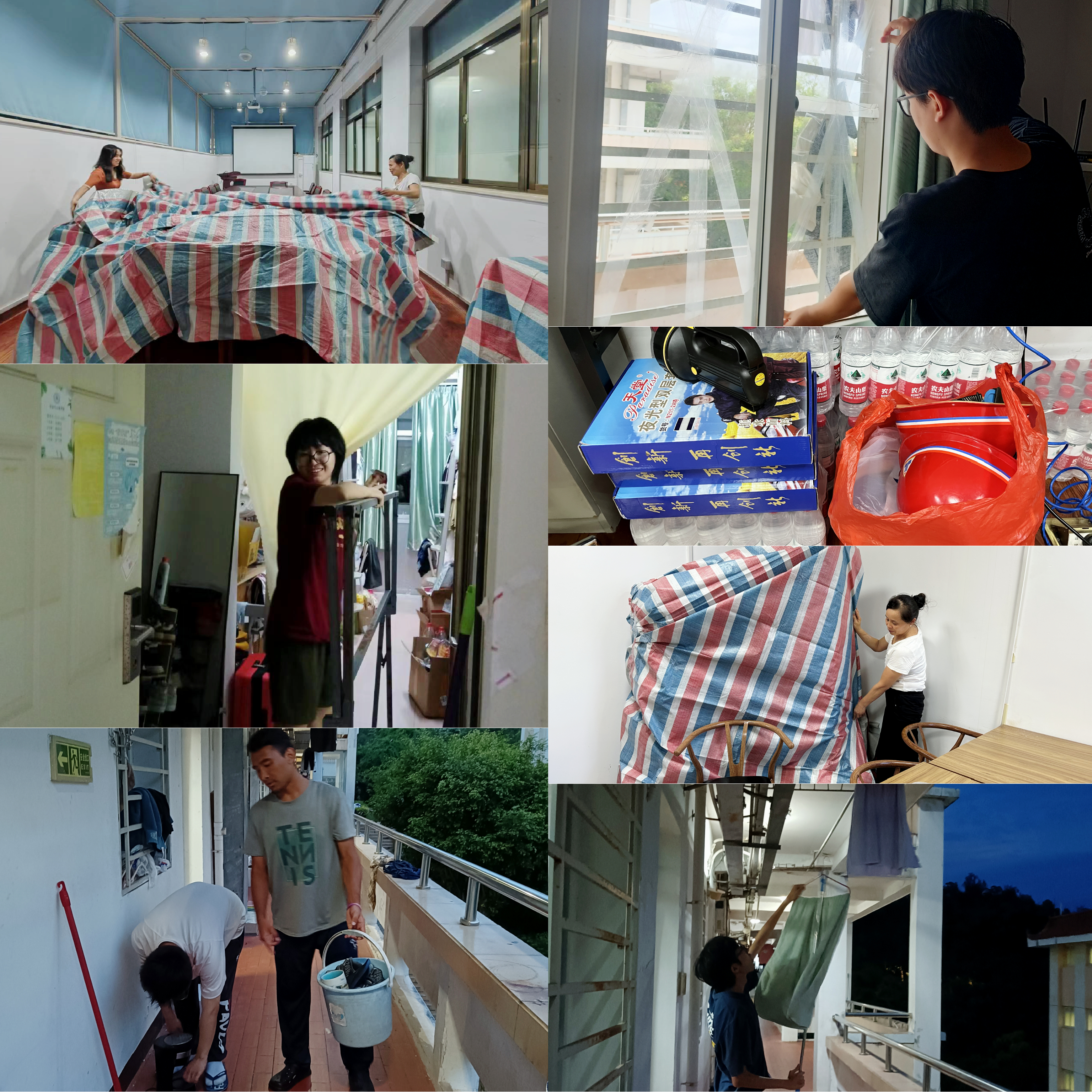 突出重点,措施到位。学院领导、教师、办公室成员、辅导员等多轮次深入公共场所、教师工作室、实验室、学生宿舍等防范重点区域开展地毯式、全覆盖排查。通过检查和加固门窗、布置防风抗洪设备设施、储备应急物资、多次提醒师生防台风注意事项、持续跟进人员行程动态等措施强化综合防御,及时消除潜在的安全隐患,保障学院和师生的生命财产安全。学院办公室、学生工作组积极通过邮件、微信、QQ群等多种渠道,及时传达学校相关通知,反复提醒全院师生做好防台风准备,统计学院师生出行情况。此外,积极做好防台风物资、值班人员的饮用水和食物等储备工作。