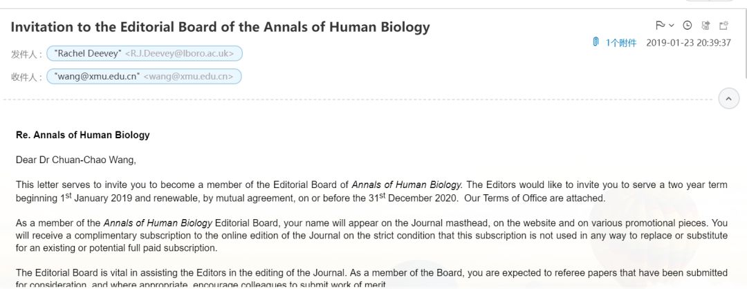 近日,我院人类学研究所王传超教授成为SSCI期刊《Annals of Human Biology》编委。《Annals of Human Biology》是生物人类学领域的国际领先期刊,每年出版六次电子版,该期刊主要发表与体质和生物人类学、人类生长和发育、人类遗传学、人口学、环境生理学、生态学、流行病学和全球健康与老龄化研究等有关的内容。该期刊的主要受众是人类学家、生物人类学家和群体遗传学家,该期刊还拥有广泛的国际读者群,包括流行病学家、儿科医生、老年病学家、生理学家和公共卫生工作者等。受邀担任该期刊的编委,王传超教授将致力于为期刊发掘高质量研究成果,推动期刊发展。这也反映出我院在人类学领域相关研究成果得到国际同行的认可,对扩大我院国际学术影响和进一步促进国际科学交流与合作将产生重要的作用。国内在该期刊的另外一位编委是北京大学公共卫生学院院长、流行病学与卫生统计学系胡永华教授。