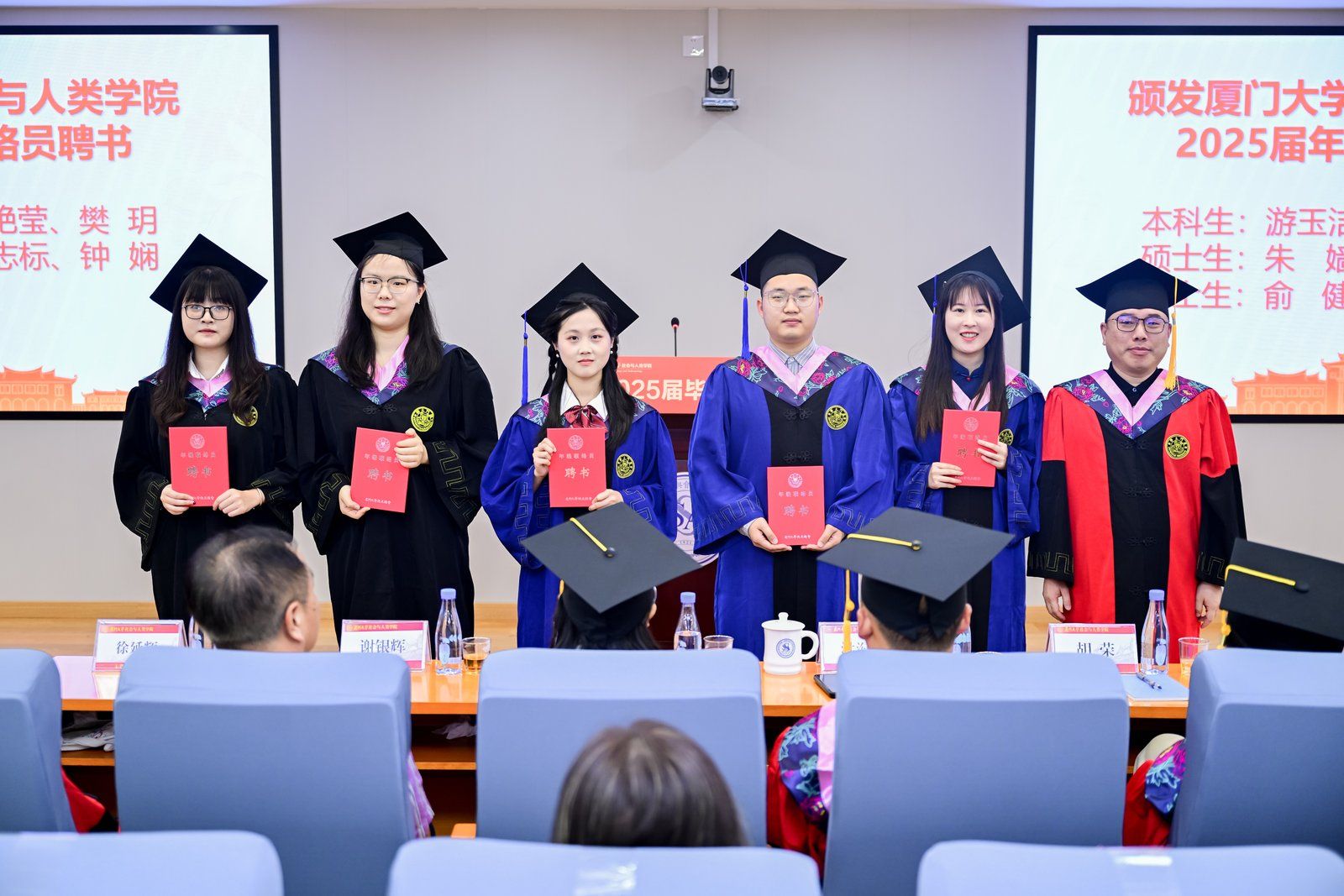 典礼上,全体毕业生向辛勤付出的老师们行谢师礼,感念师恩,并依次上台与导师们合影留念。来自学院合唱团的同学们用充满活力和祝福的歌声,为全体毕业生献上一曲《有我》,表达了对学长学姐们的美好祝福,愿大家前程似锦,未来可期。学院也给每个毕业生准备了一份特别的礼物,一个印有“厦门大学社会与人类学院”院徽的竹形杯子,既寓意厦大社人校友情一辈子,也祝愿毕业生像竹子一样坚韧挺拔,向下扎根、向上生长,在各自领域上取得更多成就。 最后,全体师生齐声合唱校歌,将典礼的气氛推向高潮。