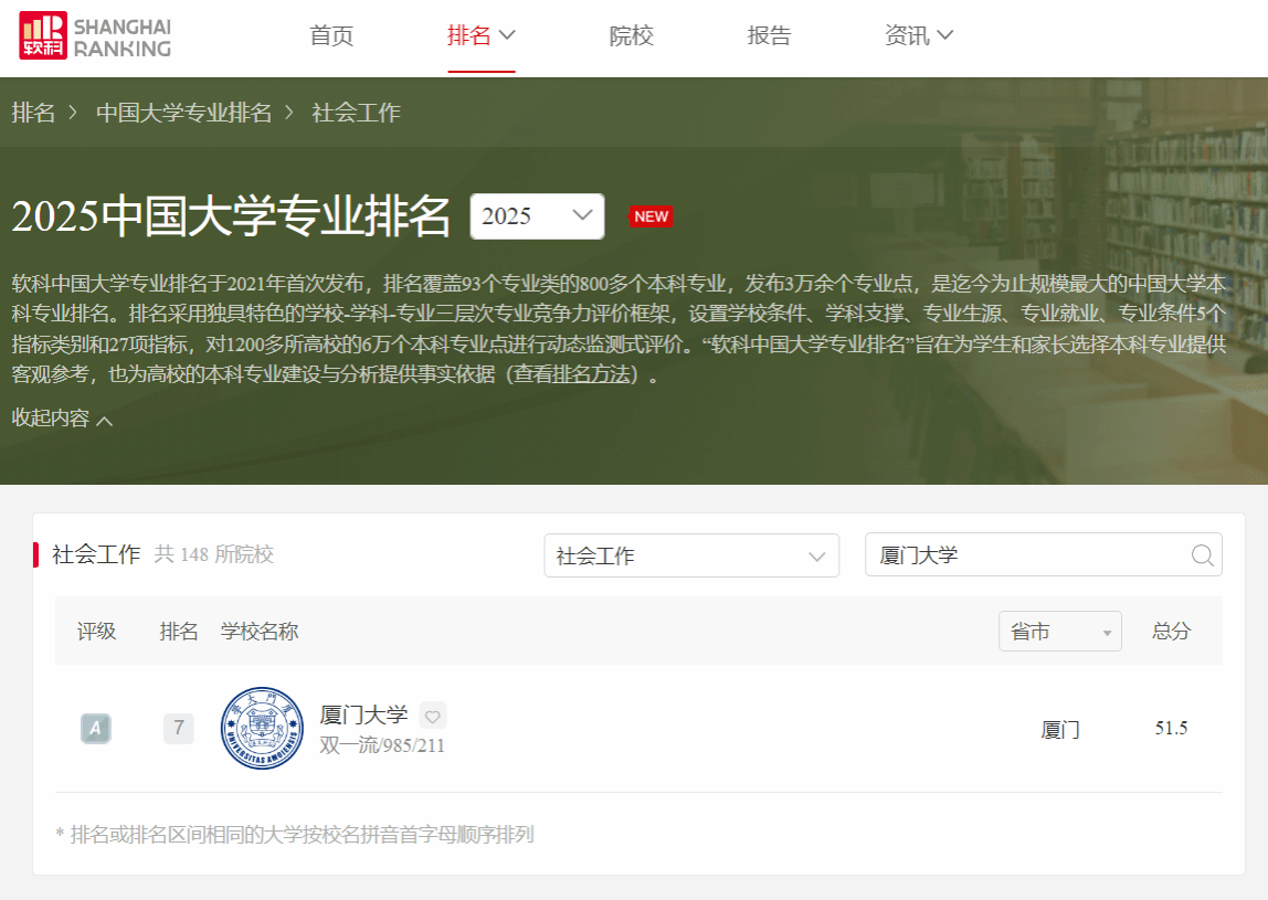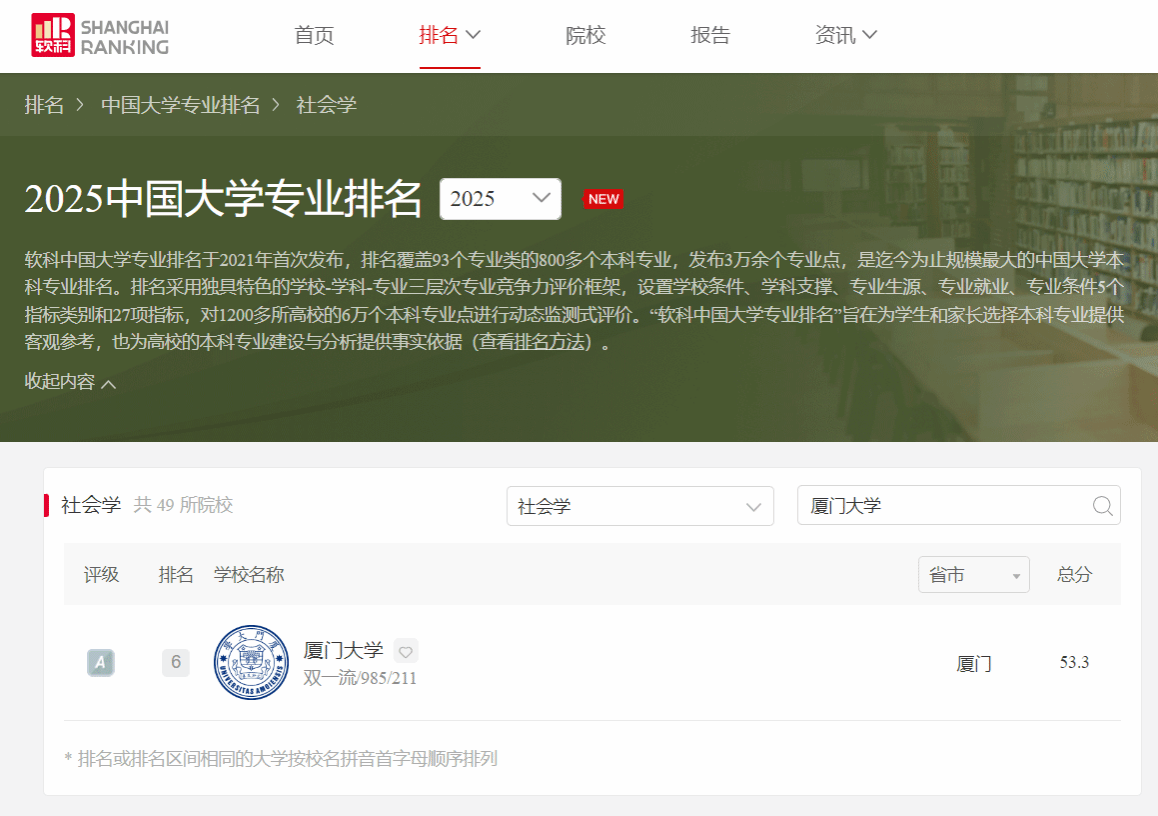 厦门大学社会与人类学院共有2个专业入选A专业。