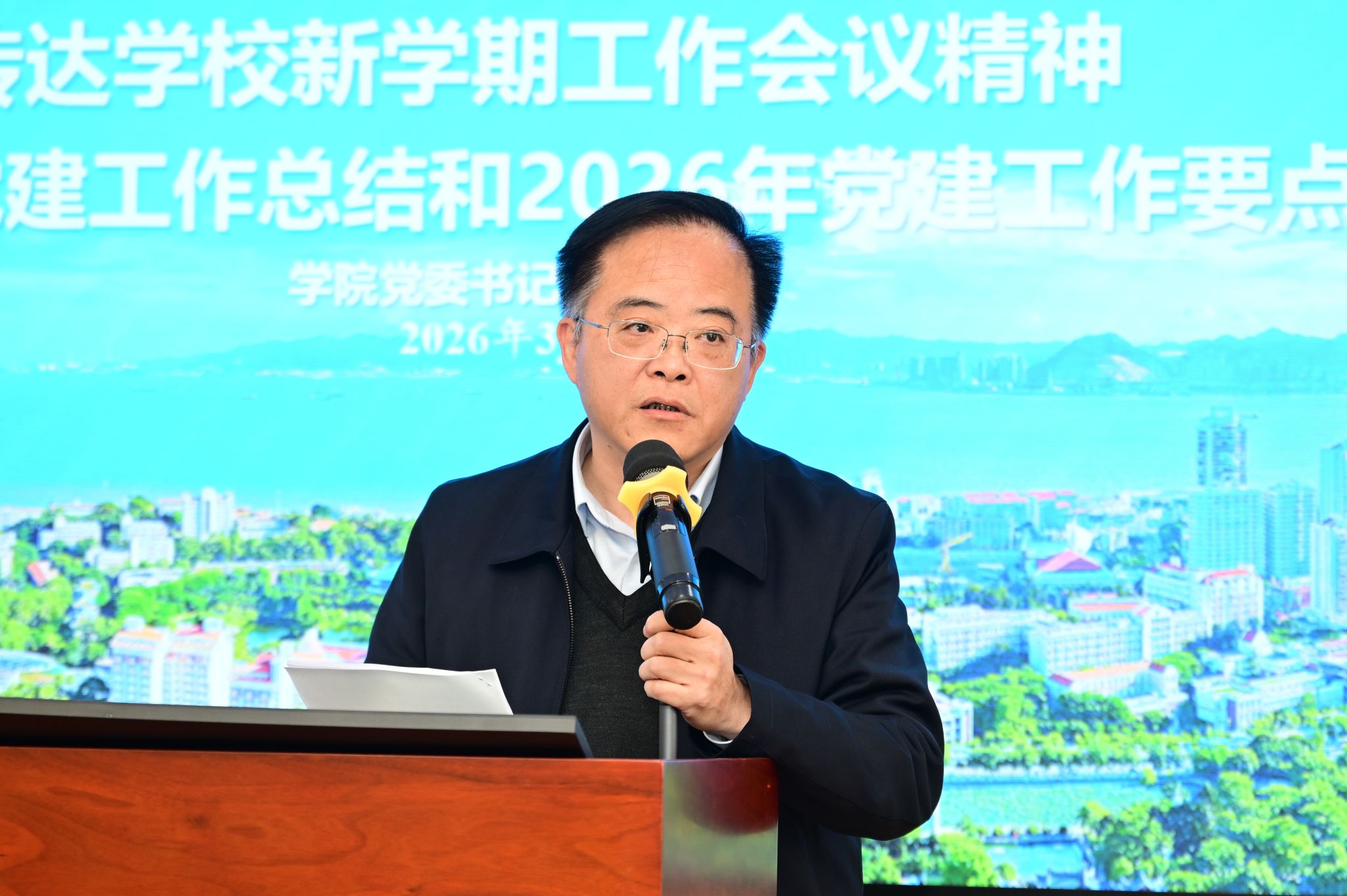 黄宝秋作学院 2025 年党委工作总结及 2026 年重点工作布置,并传达学校重要会议精神。他系统梳理了过去一年学院党委在党建工作取得的成效,明确了2026年党委工作的核心方向与重点举措,要求全院教职工把思想和行动统一到学校和学院的决策部署上来,巩固优势、融合发展、特色发展,以高质量党建引领学院事业高质量发展。