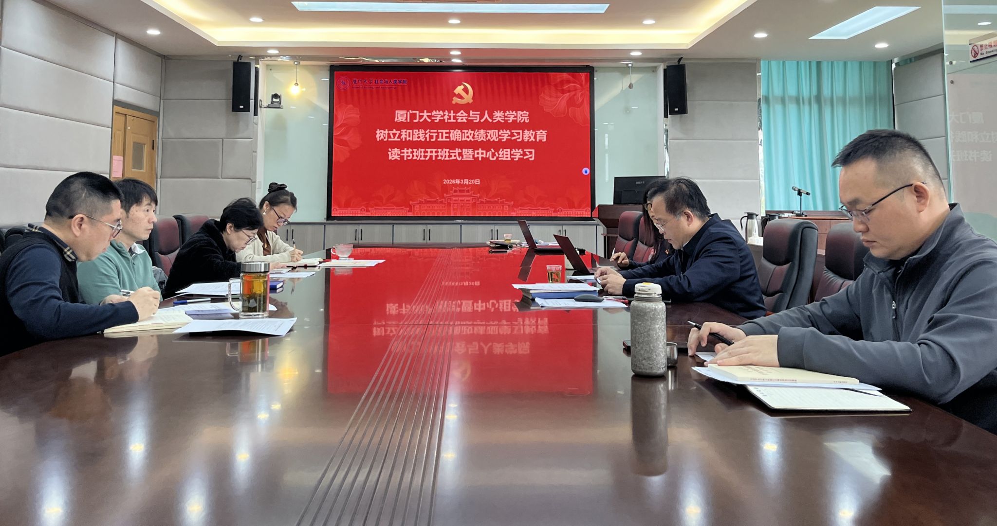 2026年3月20日上午,社会与人类学院党委举办树立和践行正确政绩观学习教育读书班开班式,学院党委理论学习中心组成员围绕《习近平关于树立和践行正确政绩观论述摘编》开展交流研讨。学院党政领导班子、党委委员参加会议。会议由学院党委书记黄宝秋主持。