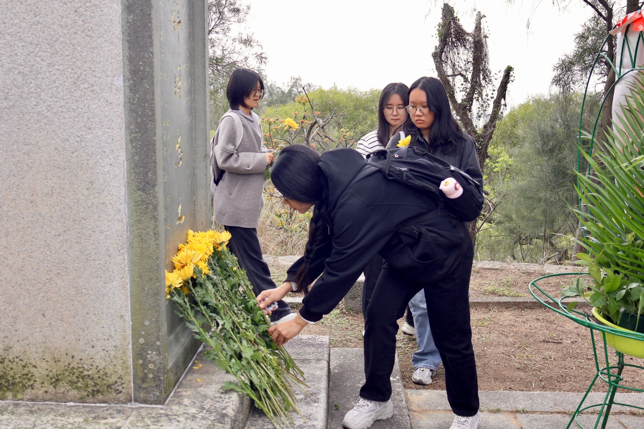 黄宝秋代表学院敬献花篮,并整理花篮缎带。全体师生肃立,向林惠祥先生墓三鞠躬。最后,师生缓步绕行墓园一圈,敬献鲜花,对林惠祥先生表达追思与敬意。