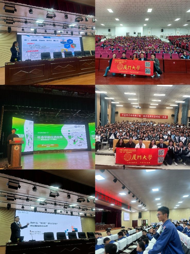 2026年4月17-19日,学院招生宣传组(以下简称宣传组)在宁夏开展招生宣传活动。本次招生宣传活动由学院院长邓燕华教授带队,社会学系助理教授富永选、赵思聪及学院秘书尹梦琴参加。宣传组先后前往银川市、西吉县、隆德县和固原市,走进银川市唐徕中学、育才中学、西吉中学、隆德县高级中学及固原市第一中学,开展招生宣讲、学科科普讲座与交流座谈活动,全面介绍厦门大学办学特色、人才培养成效、招生政策,现场反响热烈。