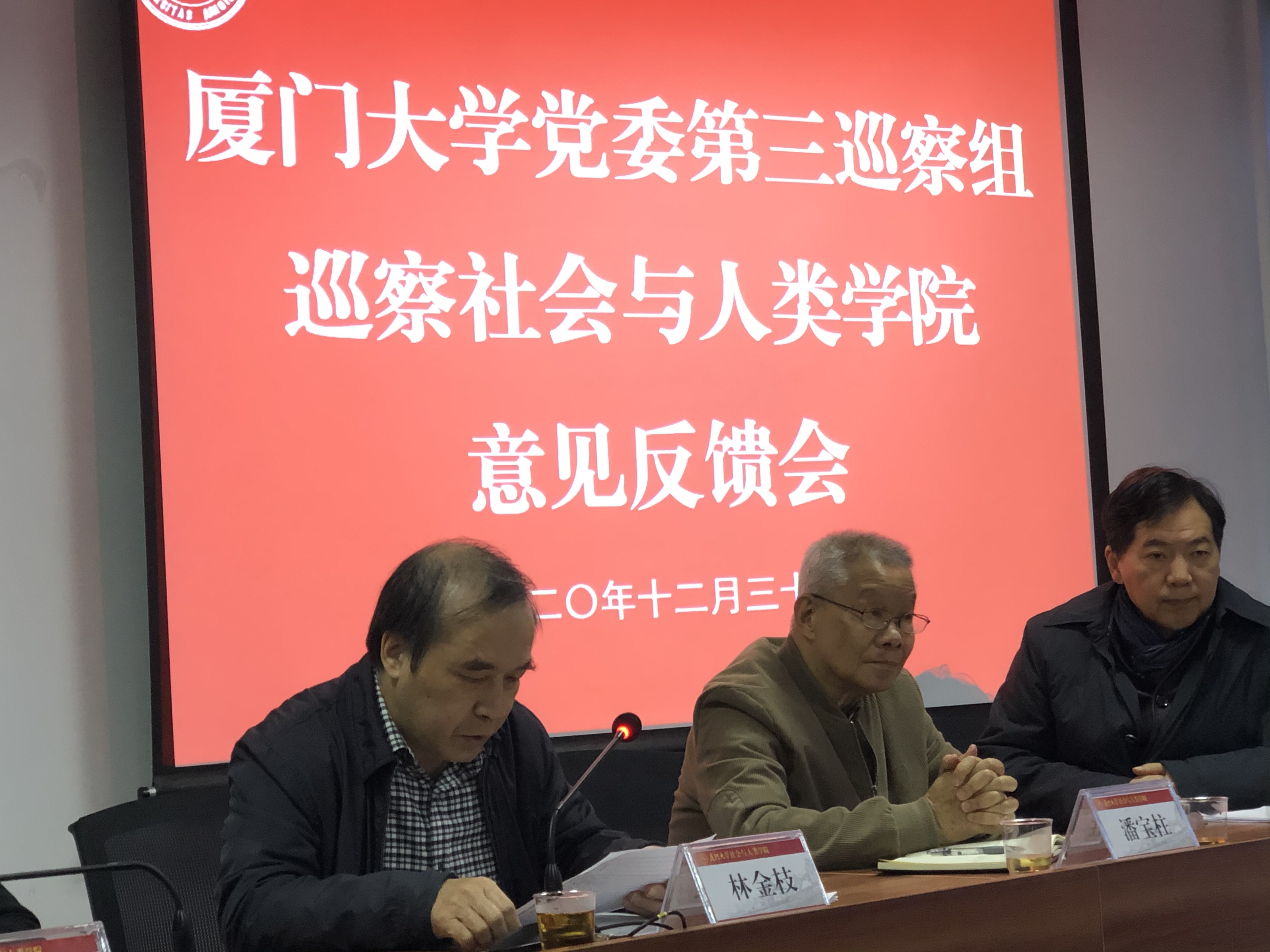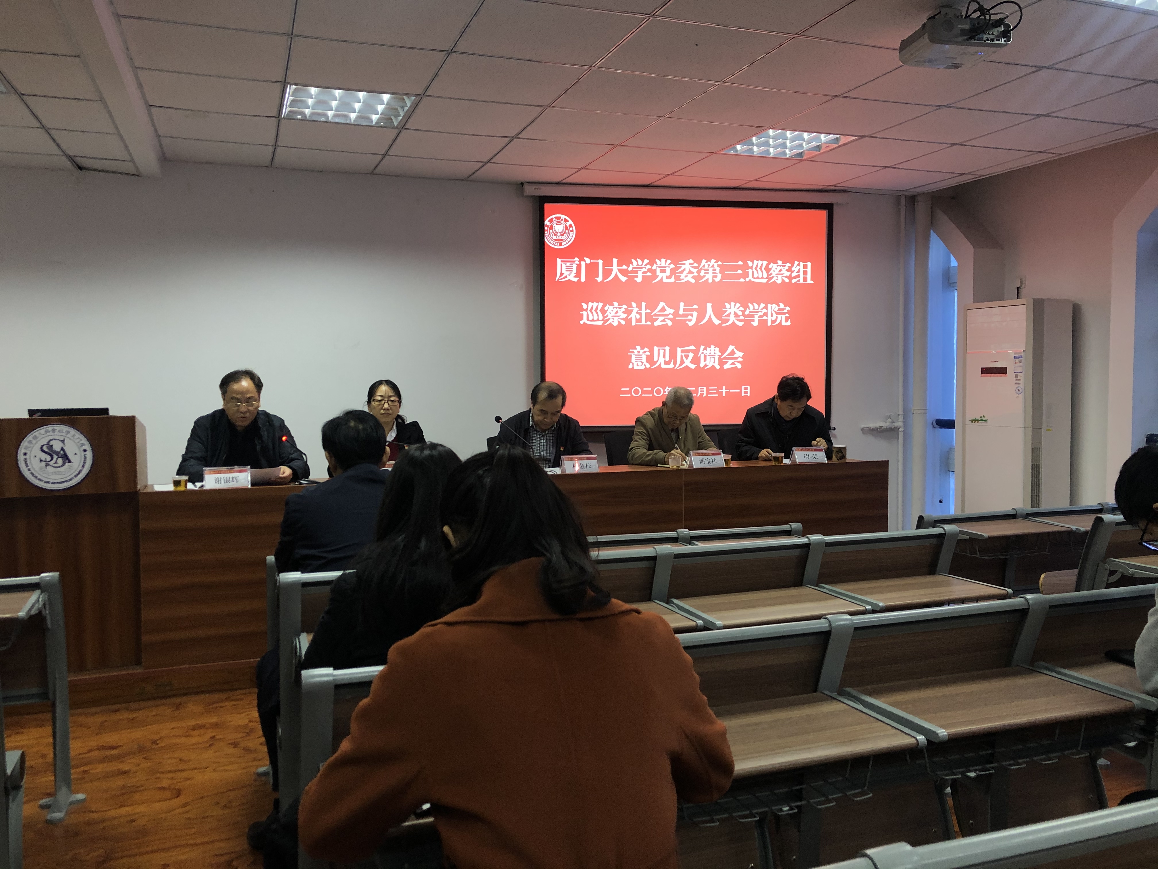 12月31日上午,校党委第五轮巡察第三巡察组巡察社会与人类学院意见反馈会在学院203室召开。校纪委副书记、纪委办主任、巡察办主任林金枝,校党委党建办主任、组织部副部长、教师工作部副部长、第三巡察组组长廖志丹,巡察组副组长、化学化工学院党委原副书记潘宝柱、学校基层党建联络员、软件学院原党委书记杨敬达等出席会议。会议由学院党委书记谢银辉主持,学院全体在职教职工参加会议。