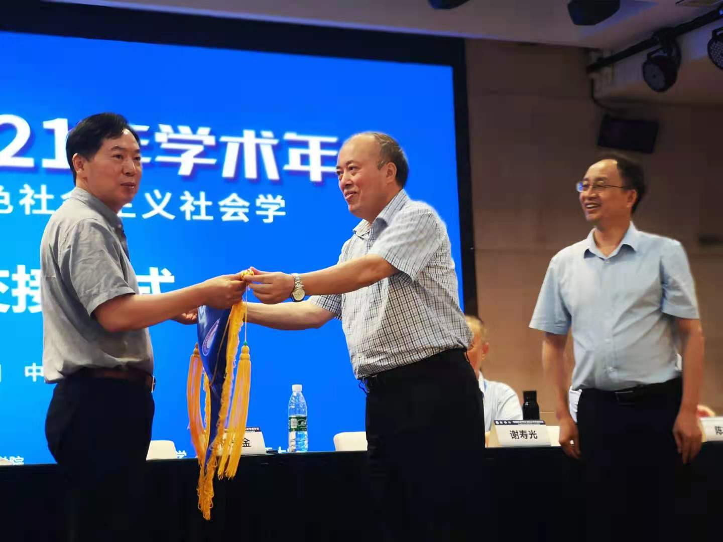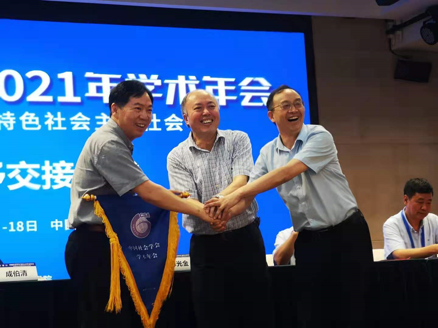 在7月18日下午的大会闭幕式上还举行了隆重而简朴的学术年会授旗仪式,陈光金会长把中国社会学会学术年会的会旗授予下一次年会承办单位厦门大学社会与人类学院。胡荣教授从陈会长手上接过年会会旗,并向全国社会学界同仁发出参会邀请,表示厦门大学社会与人类学院将全力以赴做好2022年学术年会的筹备工作。2022年学术年会将于7月16至17日在厦门大学召开,欢迎社会学界的各位专家和学者届时到厦门大学参加这一学术盛会。