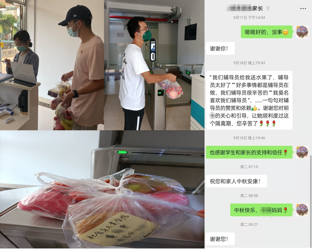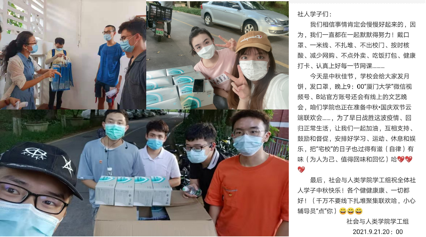 “人文关怀,严管厚爱”。疫情当前,防控升级,打乱了同学们的正常学习生活。学院学工组致力学生工作不停摆,深入学生宿舍,了解学生学习生活情况,关注学生网络上课情况,学工干部驻楼办公,上门收取新生档案,劝导同学垃圾分类,积极回应同学们关心的事务。中秋节发布“中秋暖人的一封信”、给每位在校学生发放10个口罩;为身处健康观察区的同学送去水果月饼,关心学生的心理健康状况和日常生活。9月26日晚,学院通过线上举办“社会与人类学院2021“中秋遇国庆”云端双节联欢会”,邀请全院师生线上联欢,隔离不隔爱,温暖在心间。
