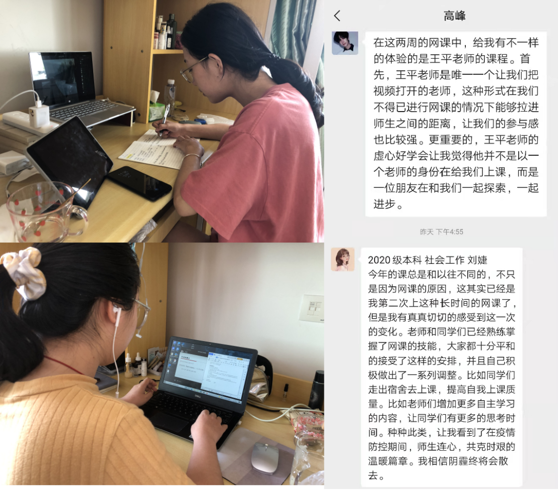不论是大一新生,还是上过一年网课的老生,面对网课他们都有新体悟。对于刚刚入学的2021级本科生王同学而言,线上上课虽没有线下课程的生动热闹,但是这更加锻炼了同学们自主搜集信息、自主学习研究的能力。“线上学习不仅让我们学会合理分配时间、提高学习效率,还能反复观看课堂视频,提高学习质量。家人也很放心我的学习和生活!”第二次经历网课的刘同学也从现实状态中真切感受到两次网课的变化。“老师和同学们已经熟练掌握了线上授课/学习技能,大家心态平和,面对网课积极做出了一系列调整。比如同学们走出宿舍去上课,提高自我上课质量;老师们增加更多自主学习的内容,让学生有更多的思考时间。师生齐心,共克时艰,我们都相信疫情的阴霾终将散去。”