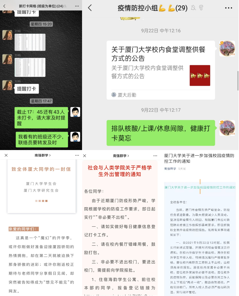 “预防在前,有序引导”。学工组落实班级-宿舍网格化管理、切实做好每日健康打卡,及时厘清学生在校情况,精准掌握学生健康情况;同时,加强疫情防控宣传工作,学院于9月14日,发布关于应对疫情自我防控注意事项的推送,转发《致全体厦大同学的一封信》,第一时间发布疫情防控最新动态,推送防疫宣传材料、科普抗疫知识,营造良好氛围,引导学生有序防疫。于9月17日发布《社会与人类学院关于严格学生外出管理的通知》,在学校封闭前就开始严格学生外出管理。9月21日召开“社会与人类学院学生疫情防控工作布置会”,向全院学生干部传达学校疫情防控的工作精神,9月22日召开“社会与人类学院学生疫情防控工作会”,向全体在校学生解读《厦门大学关于进一步加强校园疫情防控工作的通知》,做到实时跟进疫情情况,有序推进防控工作。