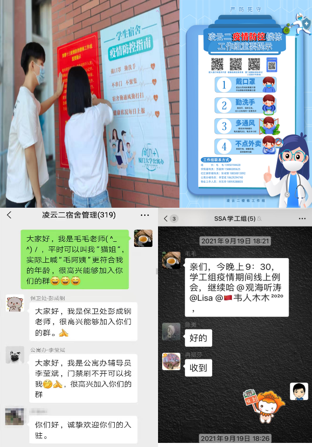 “转变模式、实时跟进”。自9月10日福建省发现本轮新冠疫情首个病例以来,随着疫情防控工作力度不断加大,院学工组在学院党委的领导下,快速调整工作模式。自9月12日起,我院学工例会由每周一次增加为每日一次,落实学校工作布置,讨论学生疫情防控措施,及时沟通处理紧急事件;9月15日起,每日例会由线下转为线上21:30—22:30;9月21起,学工干部工作地点从曾呈奎楼转到学生宿舍区。虽然工作模式因疫情不断调整变换,但关护学生的心不会变。