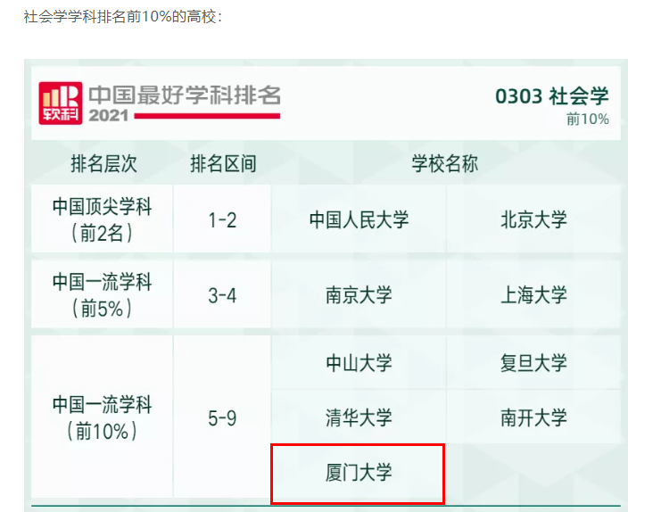 10月25日,高等教育评价专业机构软科正式发布“2021软科中国最好学科排名”。厦门大学共有41个学科名列其中。我院社会学学科入选“中国一流学科”,进入社会学学科前10%,位列全国第九。
