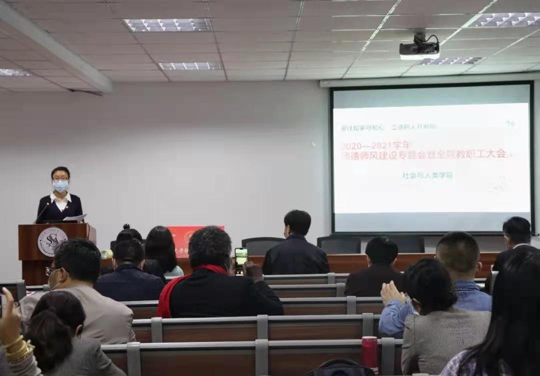 为深入贯彻落实习近平总书记关于教育的重要论述,扎实推进学院教师思想政治和师德师风建设工作,2021年11月15日,学院在曾呈奎楼206室召开“鉴往知来守初心,立德树人开新局:2020—2021学年师德师风建设专题会暨全院教职工大会”。厦门大学师德师风宣讲团成员、社科处处长高和荣教授应邀作师德专题讲座。学院党委书记王晓丽、院长胡荣及近50位教职工出席,会议由学院党委副书记毛毛主持。