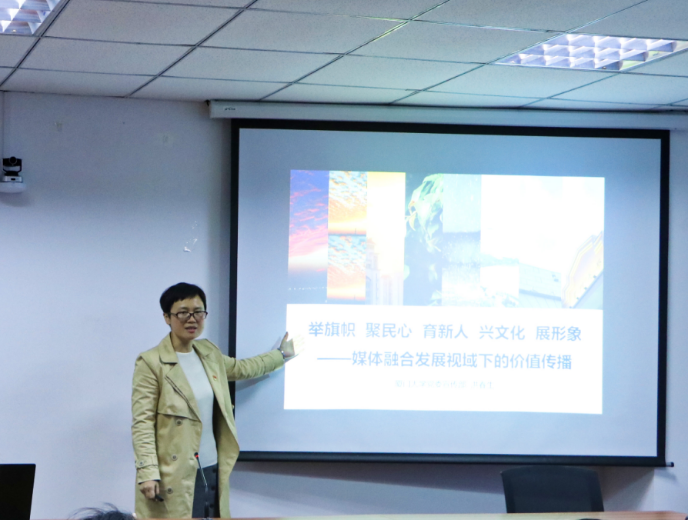 洪春生老师以《“举旗帜 聚民心 育新人 兴文化 展形象”——媒体融合发展视域下的价值传播》为题,紧扣十九届六中全会精神,从媒体融合发展、练就“点金之笔”、构筑“缓坡”、请勿“入坑”等方面入手,结合具体工作案例,为在场师生讲授了一场生动的专题宣传课。无论是对媒体融合发展新趋势的精准概括,或是对基本新闻写作“讲清事实、理顺逻辑和找出亮点”的生动分析,还是对写作的“雷区”总结,洪春生老师于现场分享的满满干货都让在场师生对宣传工作有了更深刻的认识。
