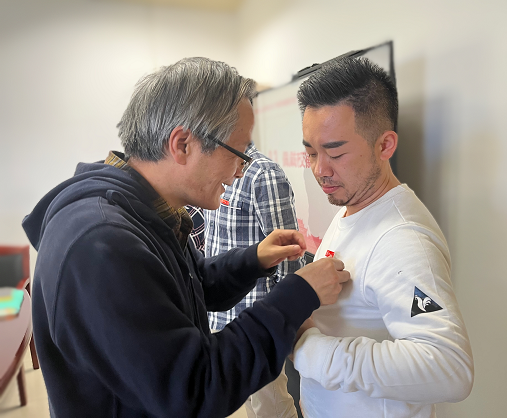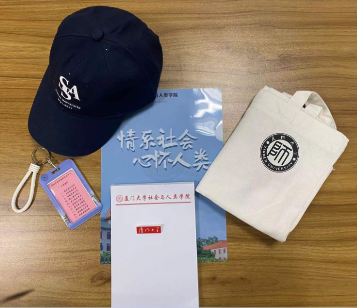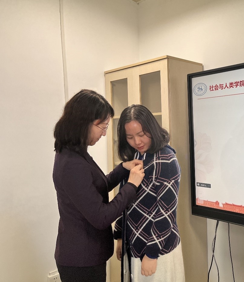 随后学院党委书记王晓丽与童敏一道为与会青年教师佩戴校徽并赠送装有《新时代高校教师职业行为十项准则》、印有厦门大学“师”者或学院logo的帆布背包、校园卡套、文件夹、太阳帽等文创纪念品,与此同时寄语各位老师继续秉承“自强不息、止于至善”的校训,为党育人、为国育才。