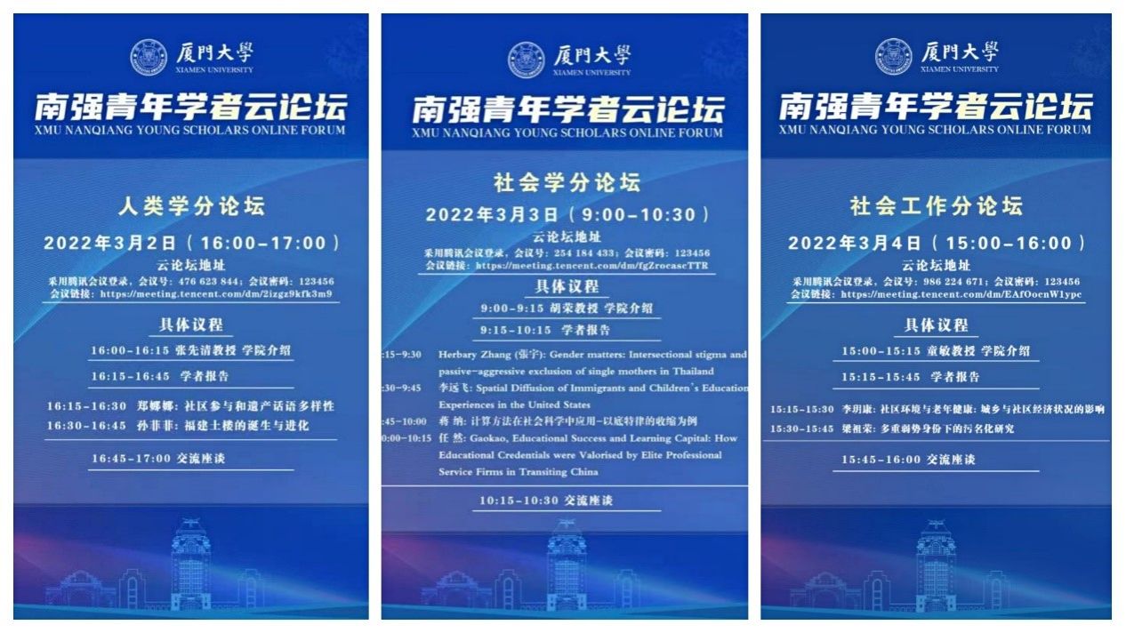 近年来,南强青年学者论坛已成为厦门大学吸引招纳海内外青年人才的重要平台。为进一步做好人才队伍建设,全方位引好、用好人才,2022年3月3日至5日,我院承继历年经验,继续举办南强青年学者学科分论坛,与海内外优秀青年学者“云端”相聚。学院各系所领导、中青年教师代表参加论坛。