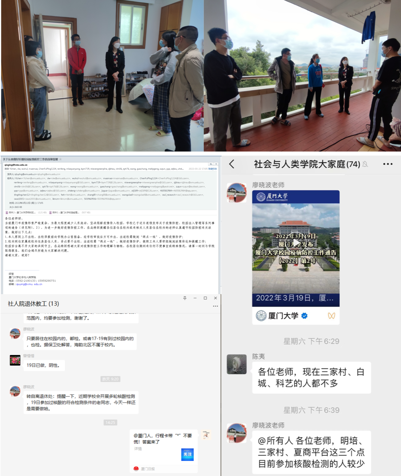 学院党政领导、工会、办公室、各系所、党支部分头行动,代表学院对全体教职工情况进行摸排和慰问,尤其对退休教职工中高龄、空巢、行动不便的老同志,由专人负责对接联络,及时了解相关情况,为特殊时期老同志们的身心健康提供了支持与保障。学院教工微信群“社会与人类学院大家庭”中,老师们分享疫情期间的生活资讯和线上教学科研小技巧,大家相互加油,温情守望相助。