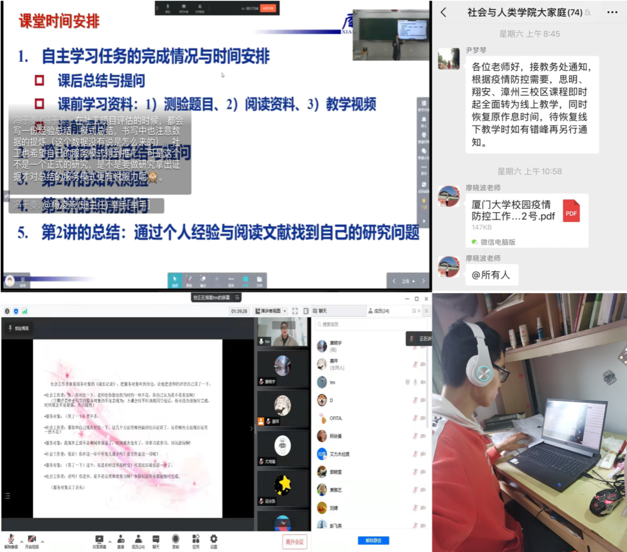 尽管受疫情影响,但是学院坚持高质量推进教育教学“停课不停教、停课不停学”,47门本科生课程和16门研究生课程迅速由“线下”教学转为“线上”授课。任课教师和教学秘书迅速响应,1小时内收集完63门课程网上授课链接,第一时间公布给所有学生,高效为“线上”教学做好保障。