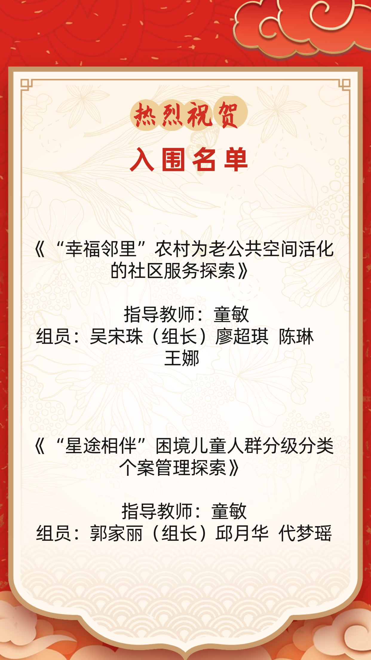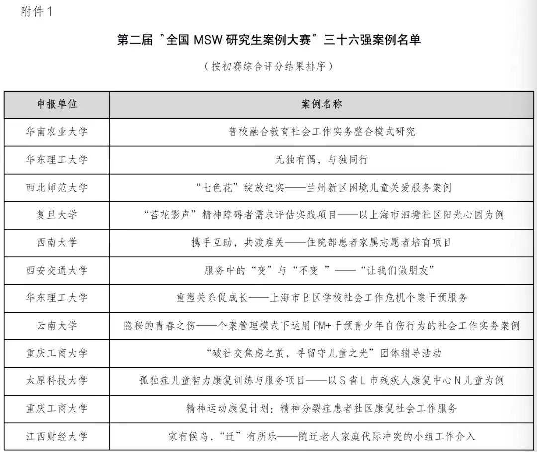 2022年4月28日,我院两个MSW研究生参赛案例成功入围第二届“全国MSW研究生案例大赛”36强,进入决赛。