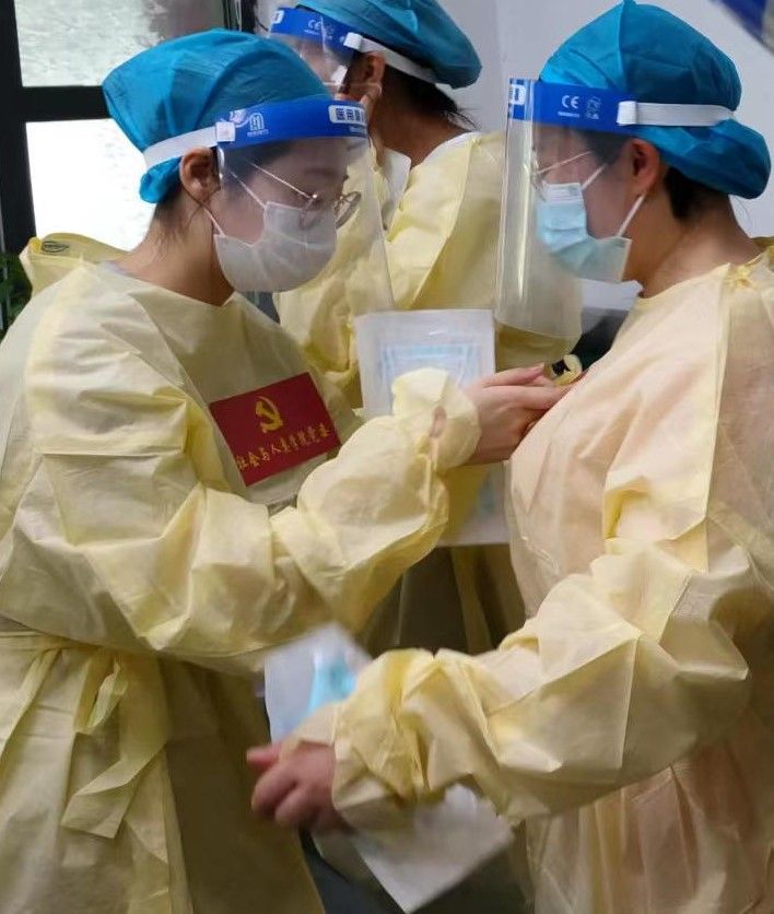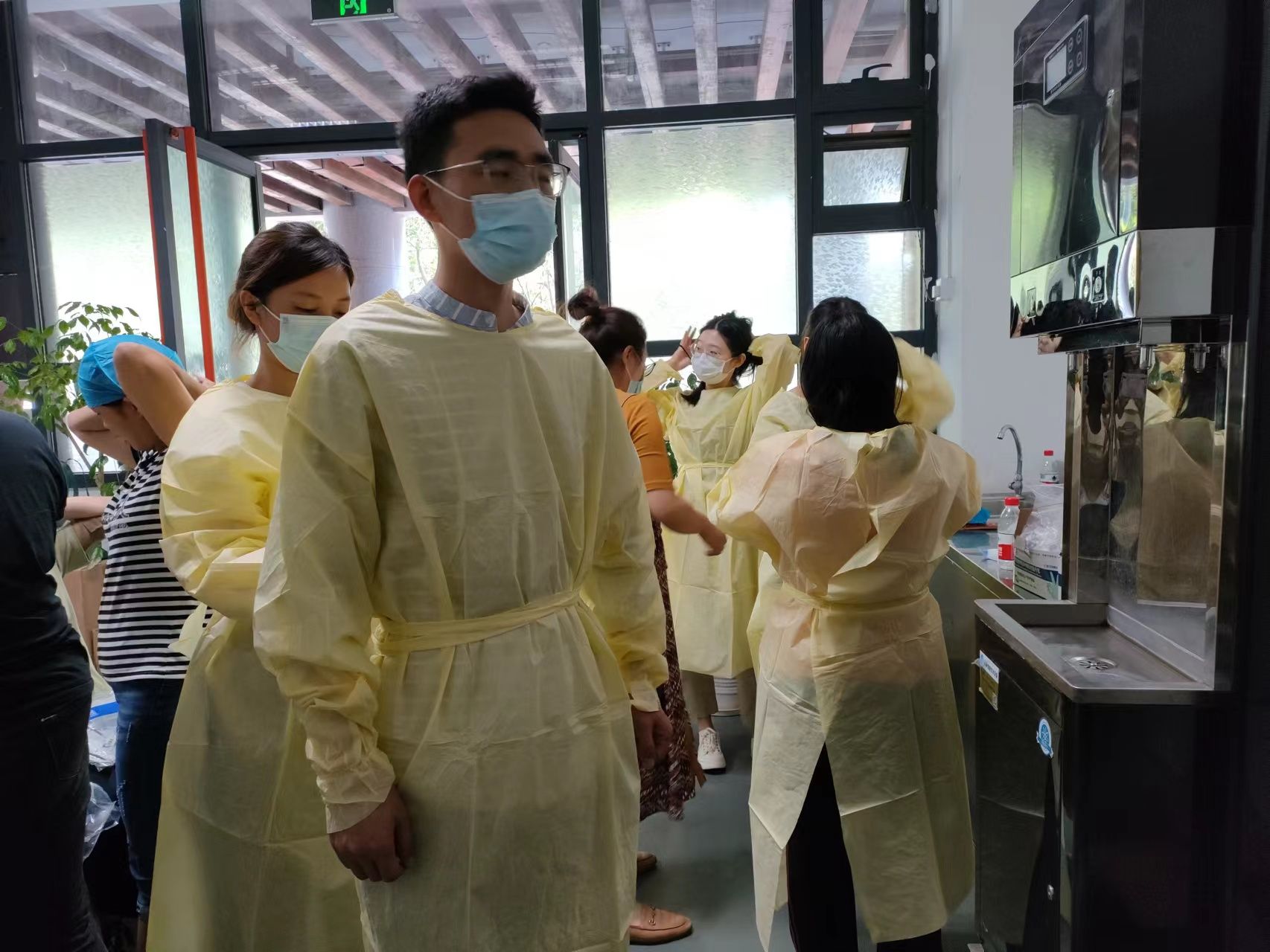 因大部分志愿者已多次参加核酸检测服务,大家一到现场,便相互帮助熟练地穿好防护服,迅速进入工作状态。