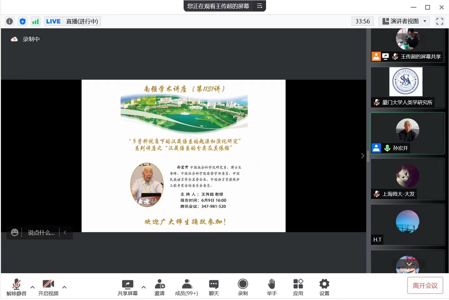 2022年6月9日下午,厦门大学社会与人类学院、人类学研究所邀请中国社会科学院研究员、博士生导师孙宏开先生做客南强学术讲座。孙先生带来了“汉藏语系的分类及其依据”的精彩讲座,社会与人类学院、人类学研究所所长王传超教授主持了本次讲座,厦大群贤和腾讯会议进行了直播,北京大学、清华大学、中国社科院等300人参与了线上会议,近千人观看了直播。