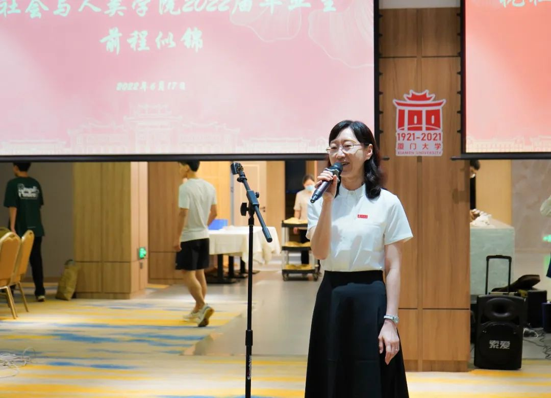 学院党委书记王晓丽老师首先祝2022届毕业生们健康快乐,前程似锦。接着,她从“发展者”、“见证者”、“学习者”、“实践者”四个身份描绘了社人学子们刚正勇毅、拼搏向前的形象,并鼓励同学们,在充满机遇与挑战的当下,以梦想为舟,以奋斗作桨,不怕吃苦,勤奋努力,披荆斩棘,奋力奔跑。同学们不应沉溺于“躺平”的陷阱,也不应被卷入“内卷”的漩涡,要保持清醒的自我,躬耕实践,不负韶华。