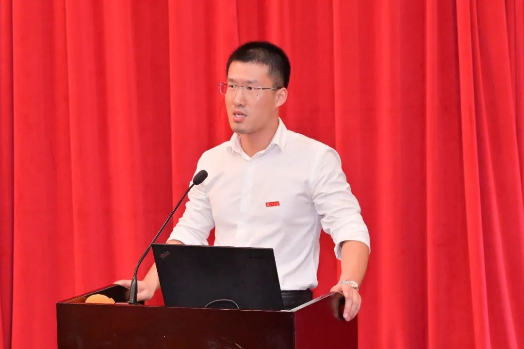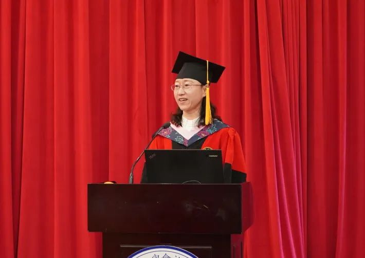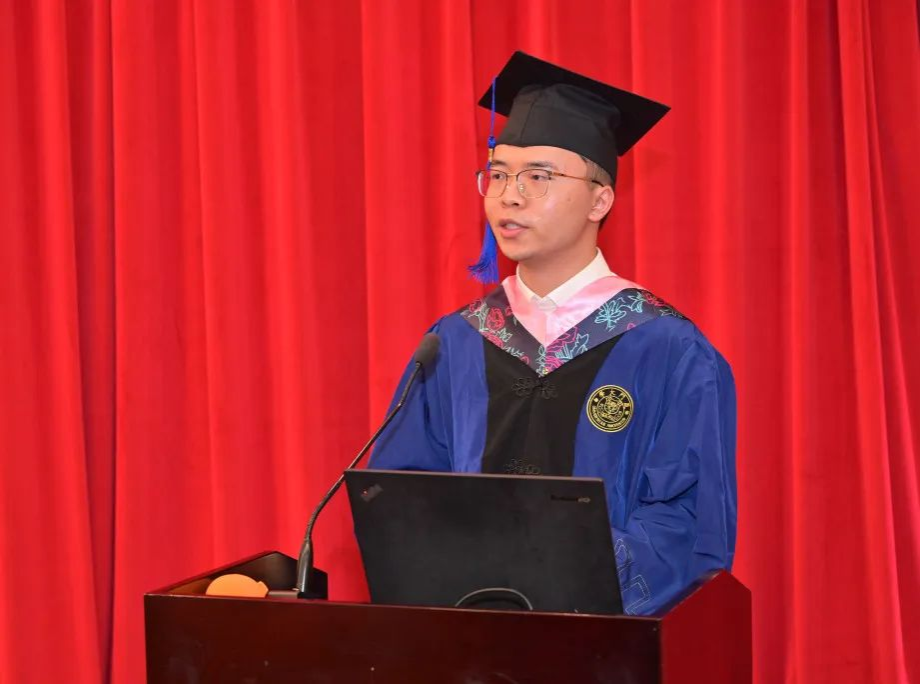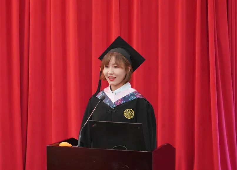 教师代表张群副教授结合自己的求学与工作通过分享自己的人生中的重要时间节点及感悟,鼓励毕业生们但行好事,莫问前程。他指出,继续求学深造的同学要做到“风物长宜放眼量”,在黑暗中探微光,下真功夫,与学海之中徜徉;将入职场的同学要乘风破浪,勇毅前行,以动人的热情,在所热爱的领域中做自己喜欢的事情。最后,他回顾了同学们在校园之中的青春记忆,从朝阳晚霞到海边听涛。他叮嘱同学们带着这份美好,在人生的之后的道路上践行“自强不息,止于至善”的校训精神,心中有火,眼里有光,做一个真诚而善良的人,在新的起点上拥抱阳光与精彩。