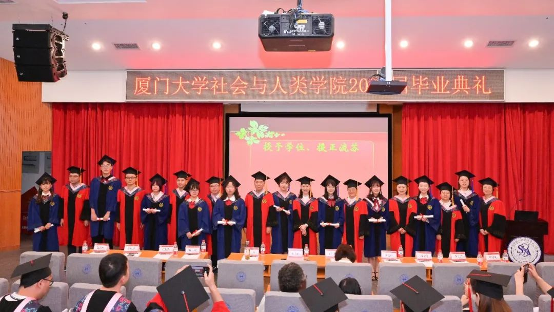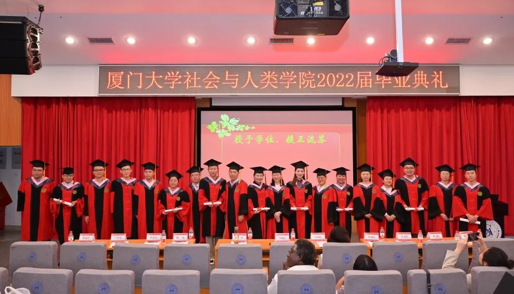 最后,毕业生们全体起立,向老师们鞠躬行礼,感念师恩,并依次上台接受老师们授予学位、援正流苏。这意味着他们真正开启了人生的又一全新阶段。少年负壮气,奋烈自有时。愿2022届全体毕业生前途似海,于海海人生中,展现厦大社人学子的风采。