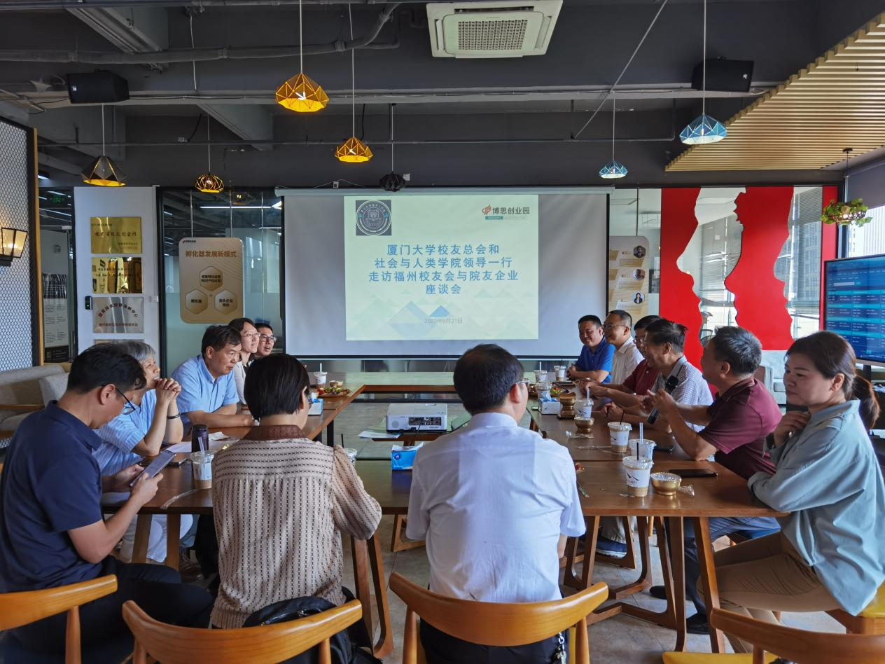 下午,学院一行拜会了厦门大学福州校友会名誉会长叶文振、常务副会长兼秘书长余少谦,大家一同走访福建省博思创业园管理有限公司并座谈。博思软件集团党委书记、监事会主席毛时敏,1999级社会工作专业校友、博思创业园管理有限公司常务副总姚丽云一同参加,姚丽云介绍了博思创业园的发展概况、企业文化、党建引航特色经验。座谈会上,大家围绕学院福州校友会的组织框架、创建流程等筹备工作展开热烈讨论,并表示将全力支持与推动校友会的建设,争取今年年底前成立学院福州校友会。