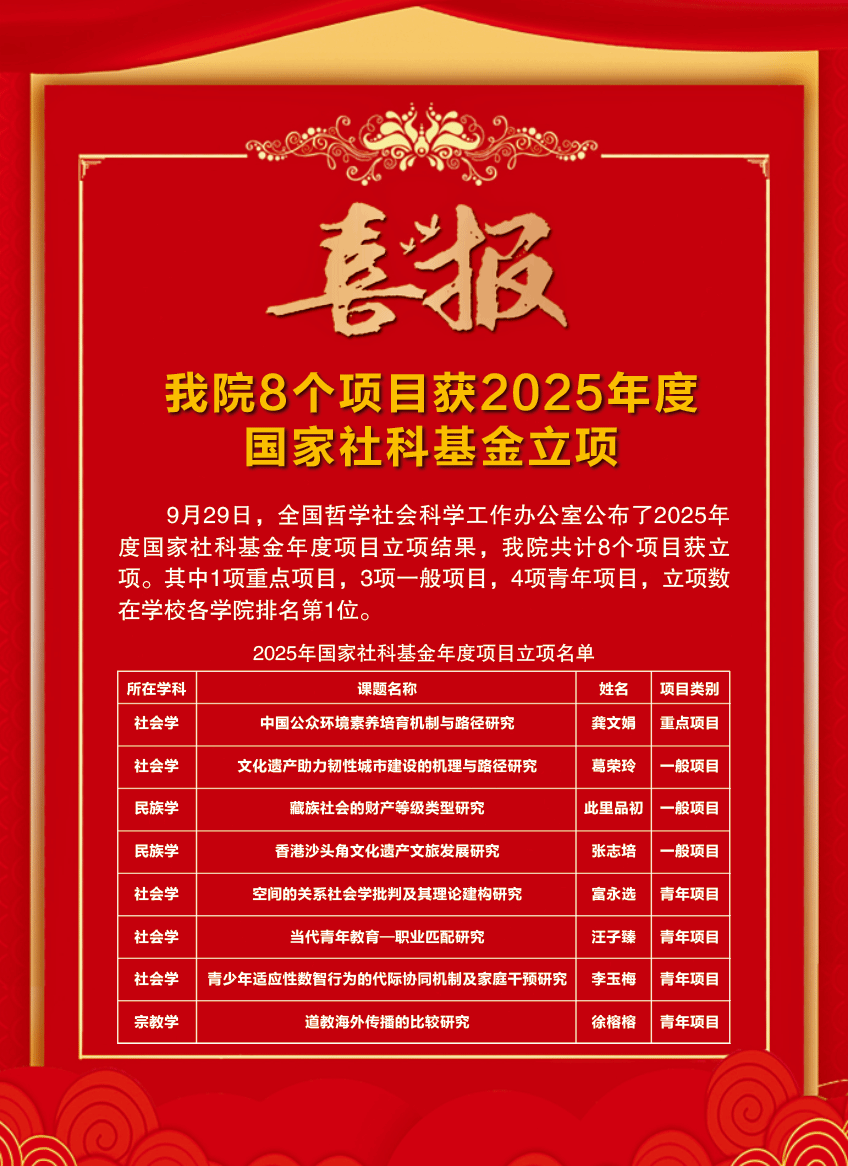 9月29日,全国哲学社会科学工作办公室公布了2025年度国家社科基金年度项目立项结果,我院共计8个项目获立项。其中1项重点项目,3项一般项目,4项青年项目,立项数在学校各学院排名第1位。