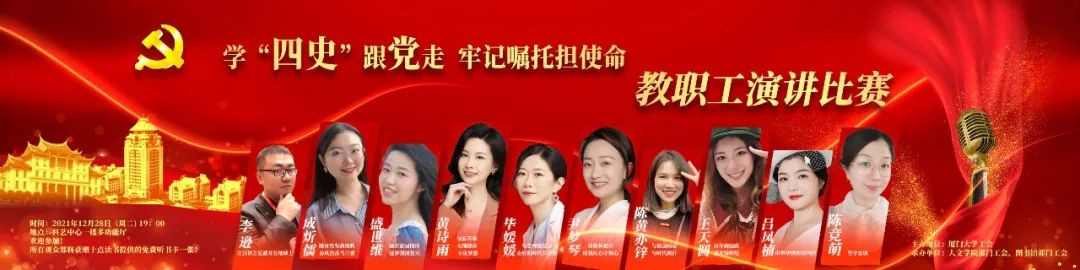 非常感谢学院强大的后援团们!学院领导、同事、还有学生团队都给了我莫大的支持和帮助。尤其是毛毛老师、蓝达居老师;毛毛老师从选题、成稿、舞台表现均给予把关审核,演讲稿件来回修改了近十稿,逐字逐句反复推敲;蓝达居老师从史料收集考证到标题确定均提供了支持;宣中的学生骨干,帮忙制作演讲视频,也是改了又改,作品最终得以完美呈现。通过此次比赛,让我学习了林惠祥先生勇于担当、敢于奉献的精神,我将不忘革命先辈的无私付出,以史为鉴,立足本职岗位担使命,在学思践悟中坚定理想信念,开创未来。
