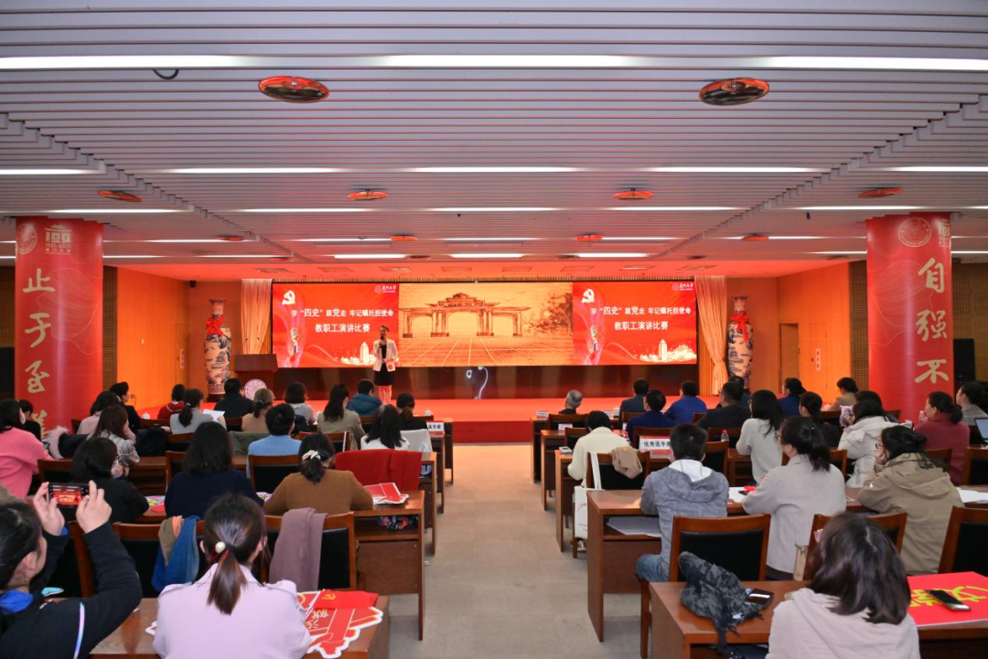 本次主题演讲比赛是为了扎实开展“四史”宣传教育,激发广大教职工以更加昂扬的良好精神风貌,将学习成果转化为立足本职岗位作贡献的实际行动。各位参赛选手不仅展现了良好的精神风貌,更重要的是激发了在场每一个人爱党、爱国、爱校、荣校的热情。